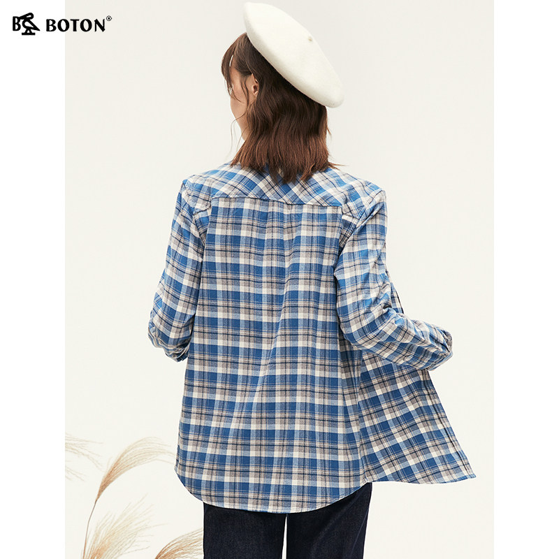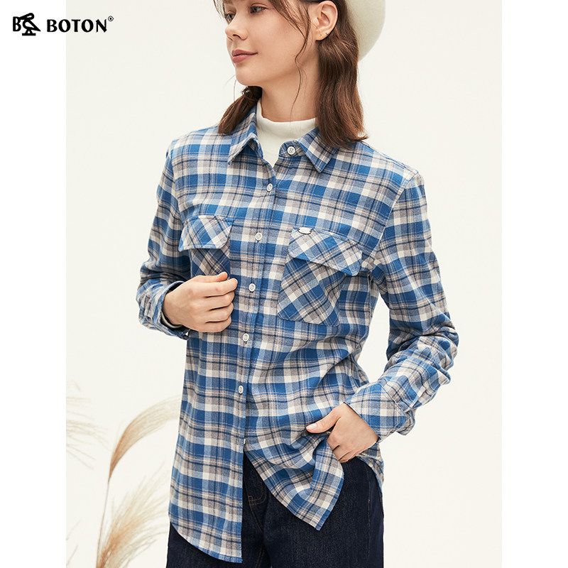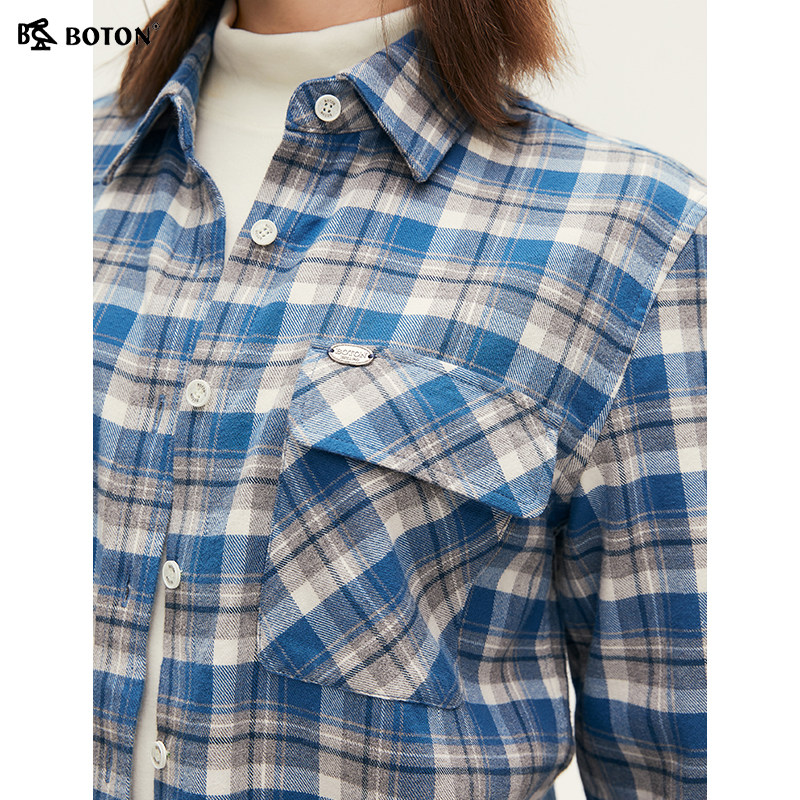 波顿2025秋新款灰蓝色长袖口袋工装风格子衬衫女高端美式休闲衬衣
