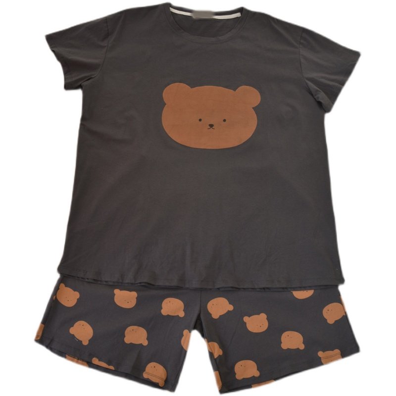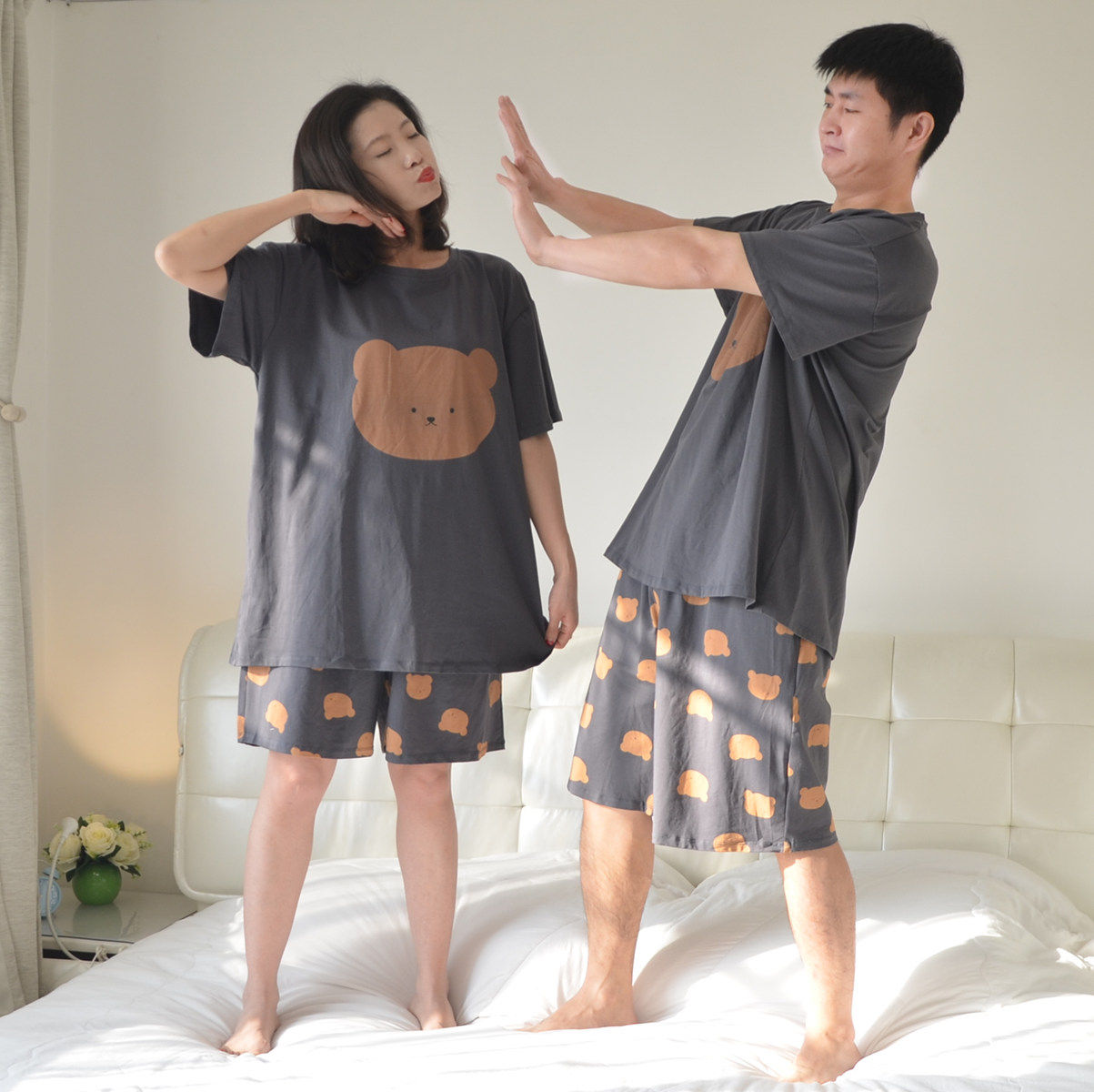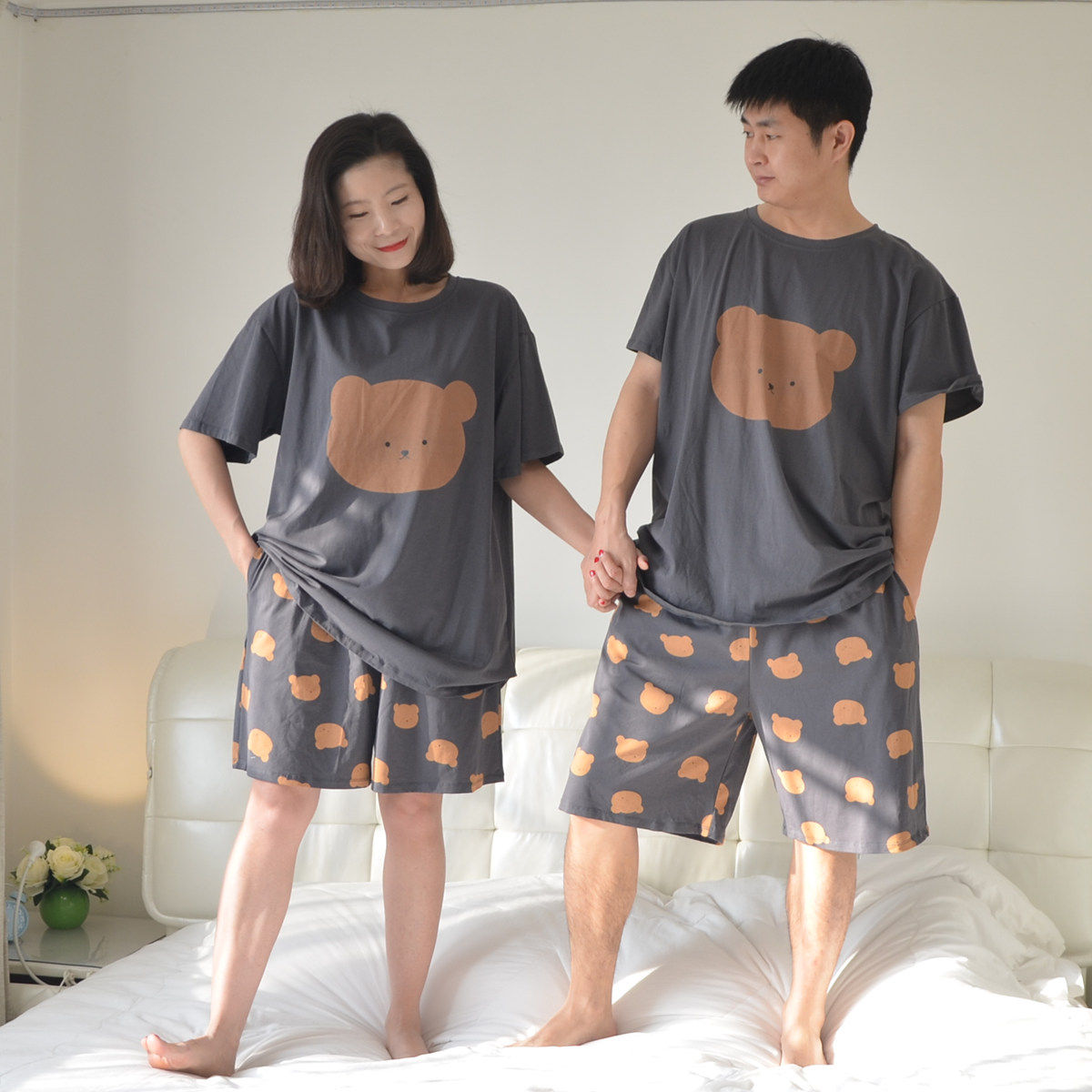 卡通熊情侣睡衣女夏季纯棉加肥大码胖男短袖短裤家居服套装200斤