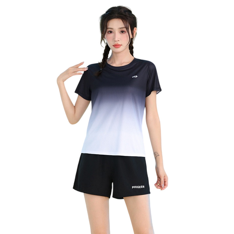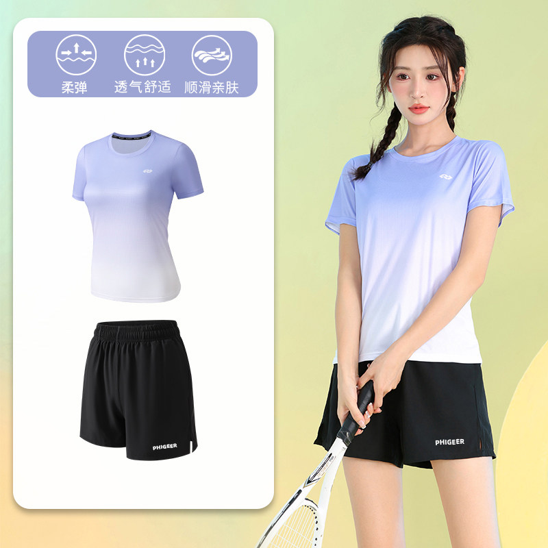 速干运动跑步服圆领套装男女大码健身户外羽毛球服瑜伽渐变短袖