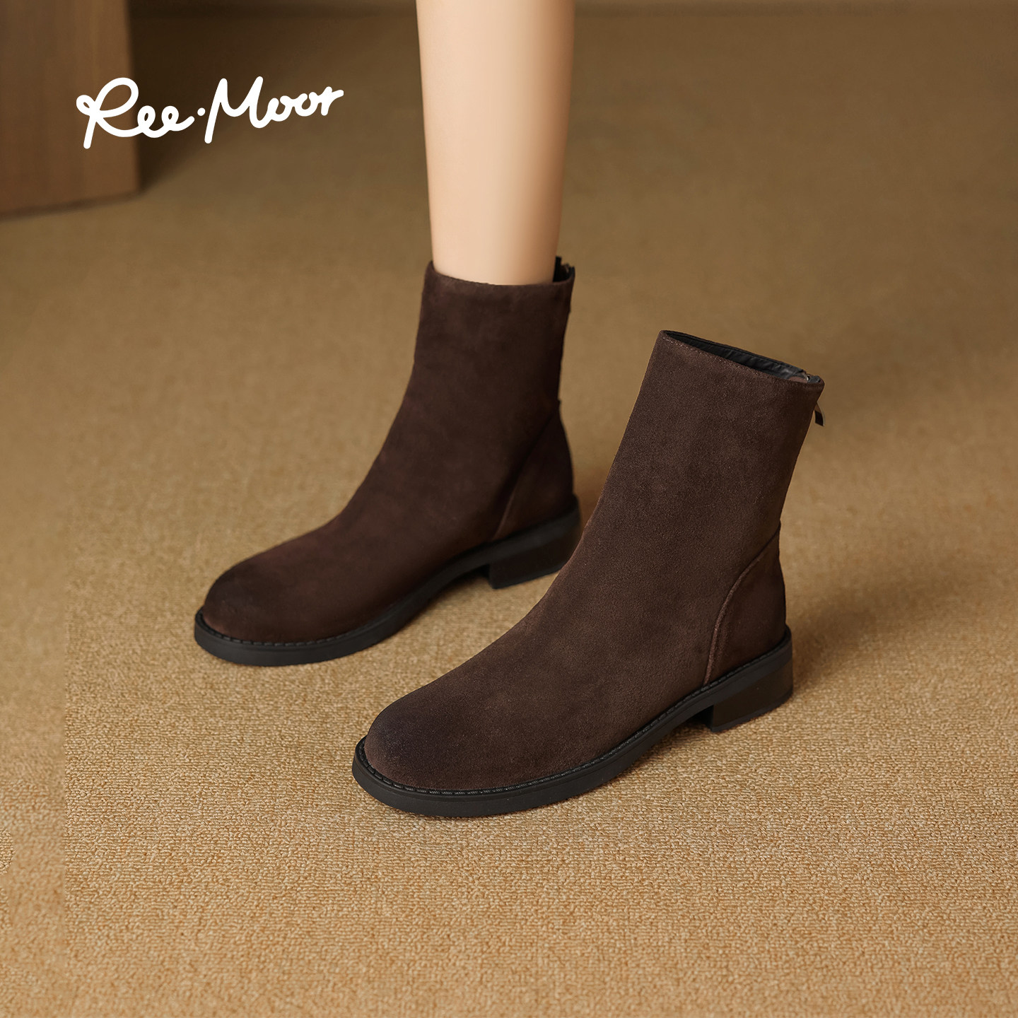 REEMOOR睿慕2025冬季新款复古英伦风圆头粗跟增高加绒切尔西靴女