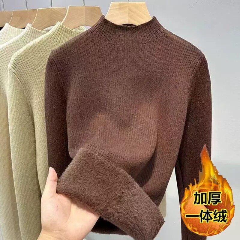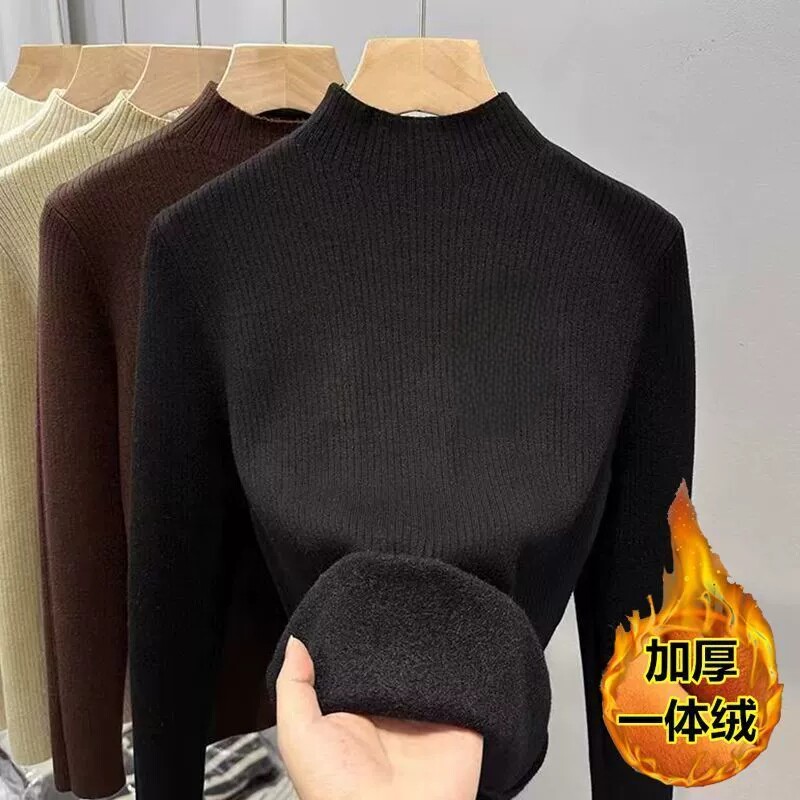 加厚一体绒刺绣针织衫打底衫女装冬季半高领加绒大码内搭毛衣上衣