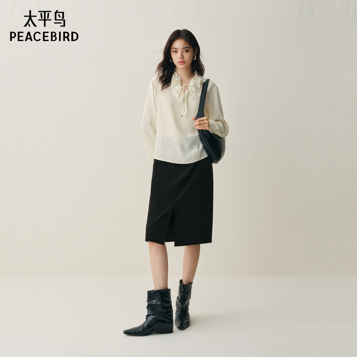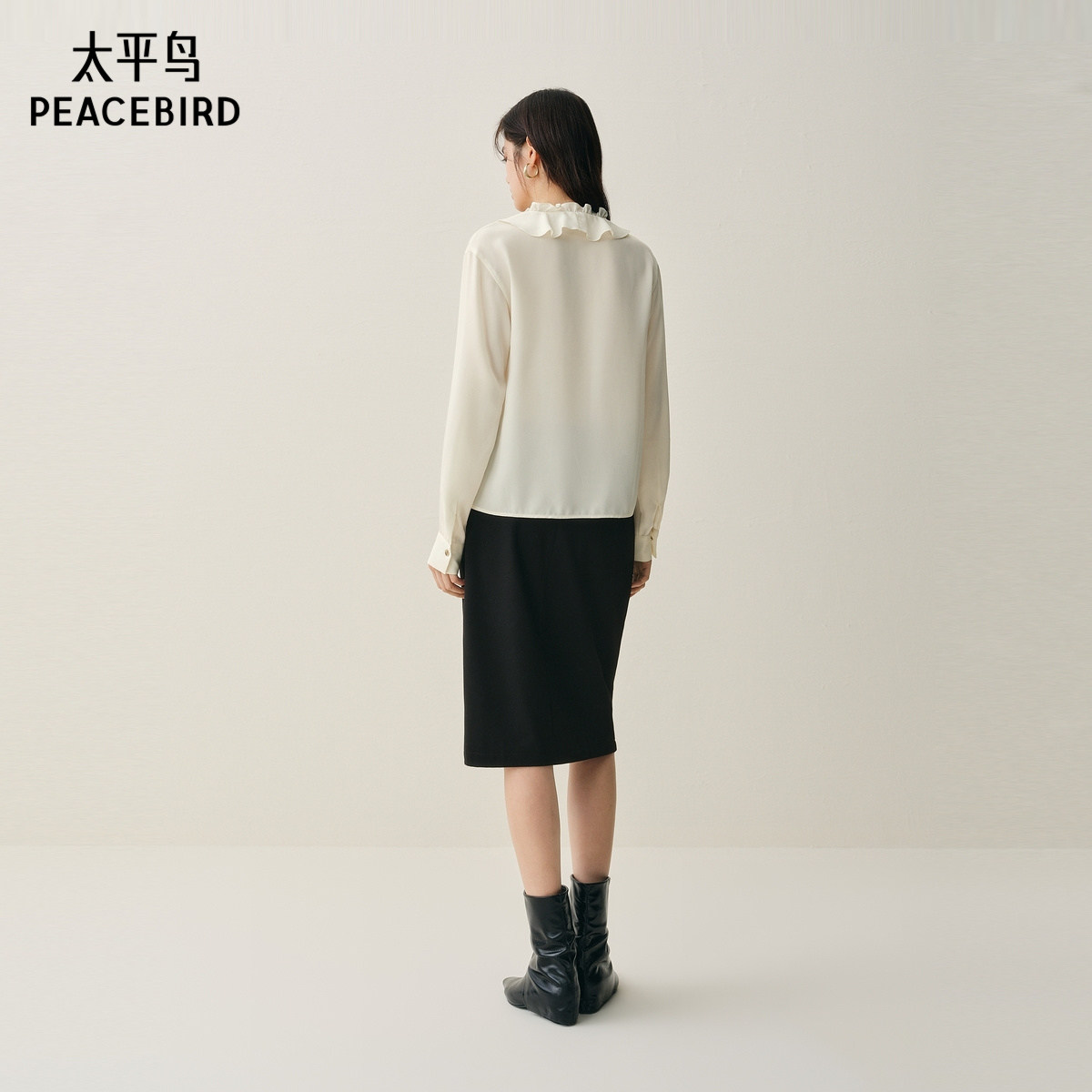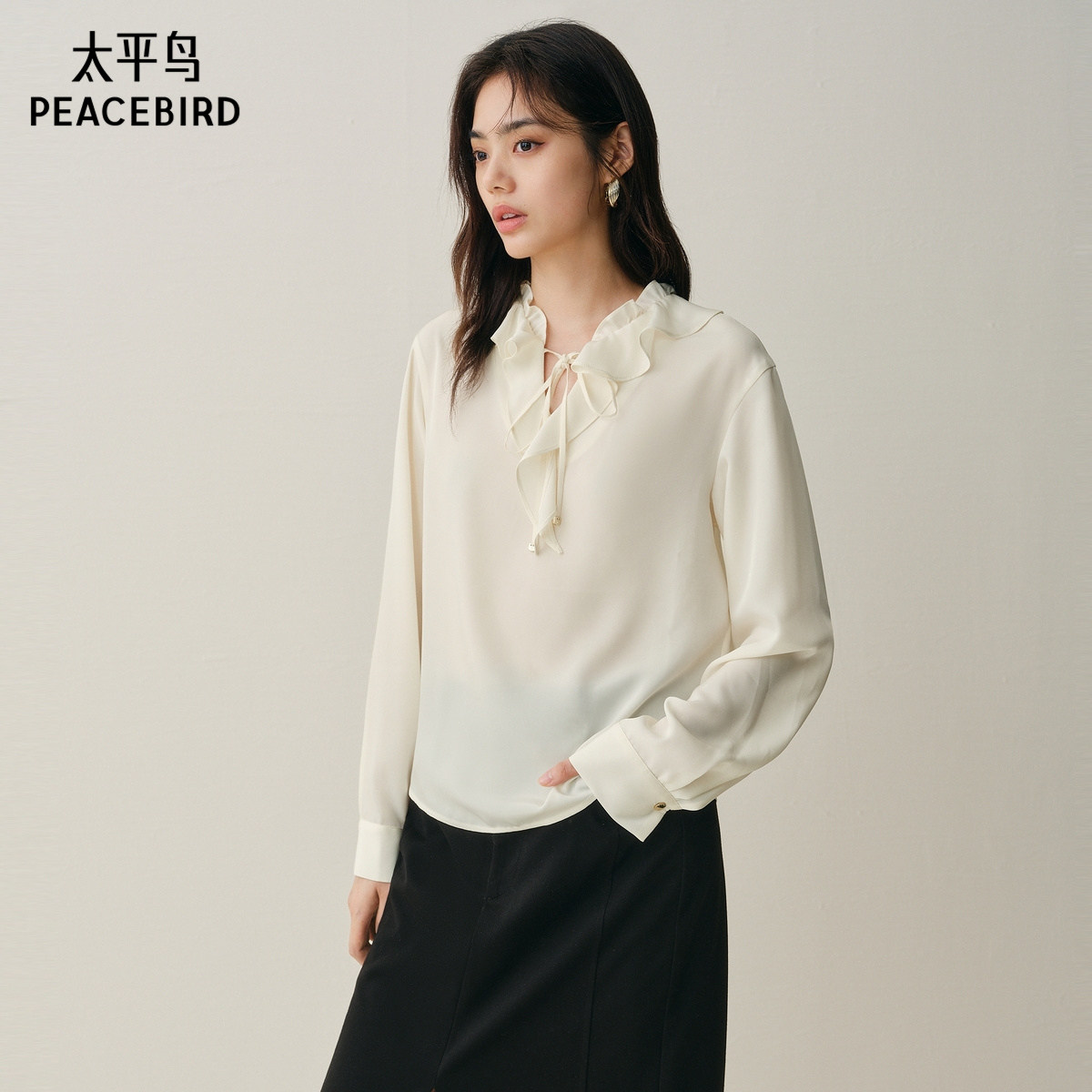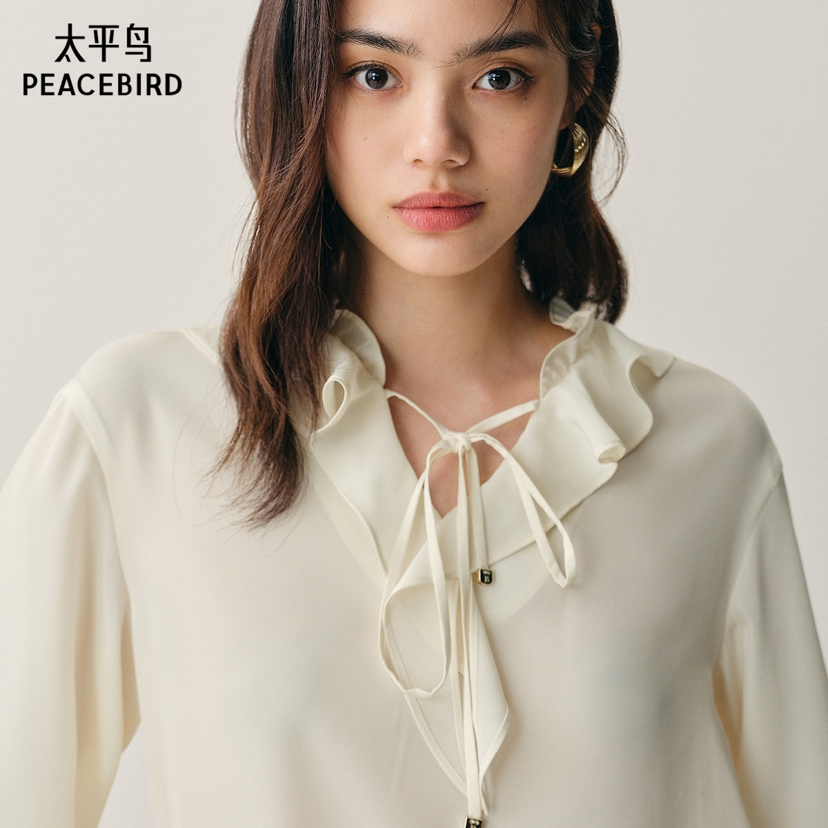 太平鸟 仿真丝轻柔荷叶边长袖衬衫25冬季新款短款内搭雪纺衬衣女*