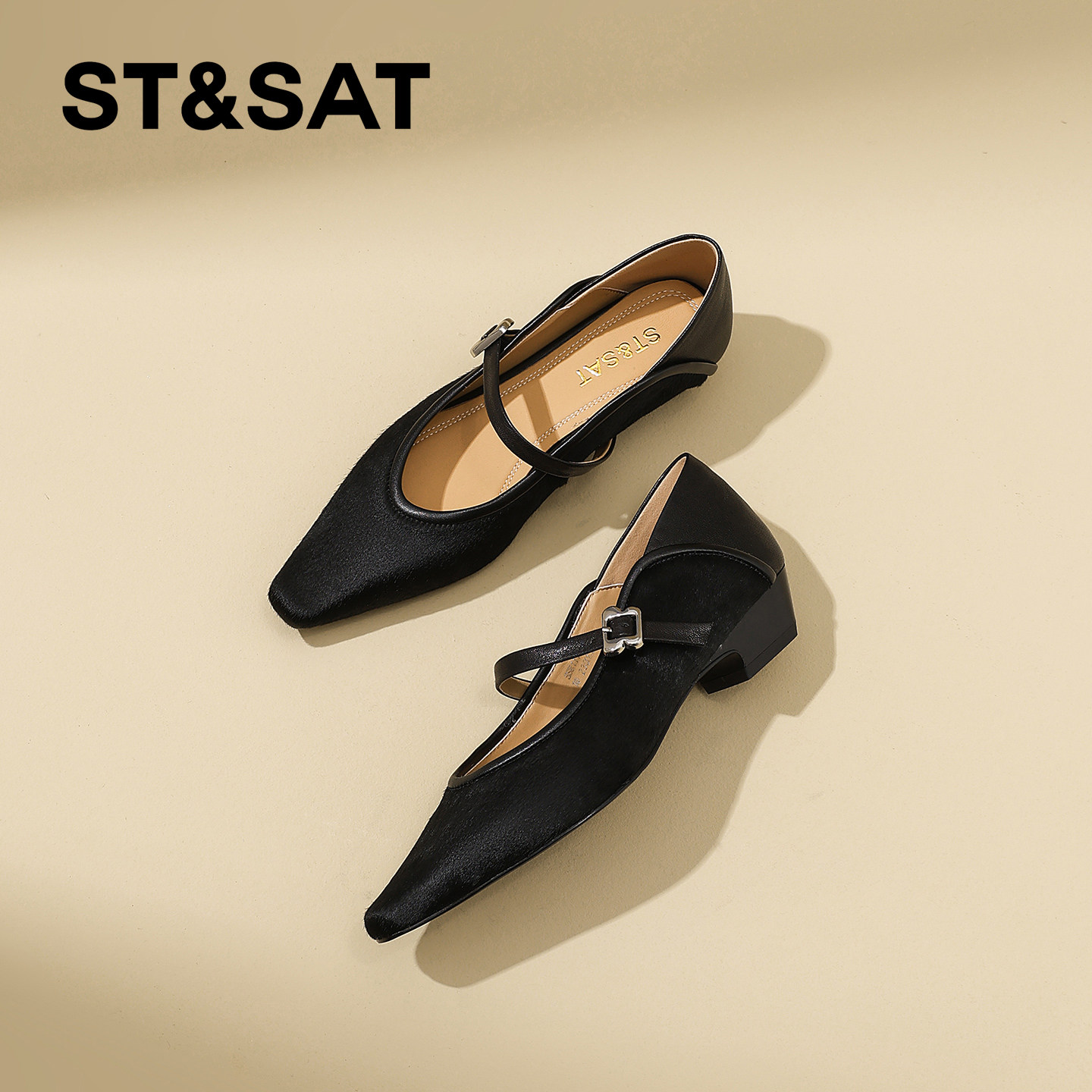 H55女鞋莎黛尔2025冬季新款毛毛鞋扣带装饰浅口平底韩版玛丽珍