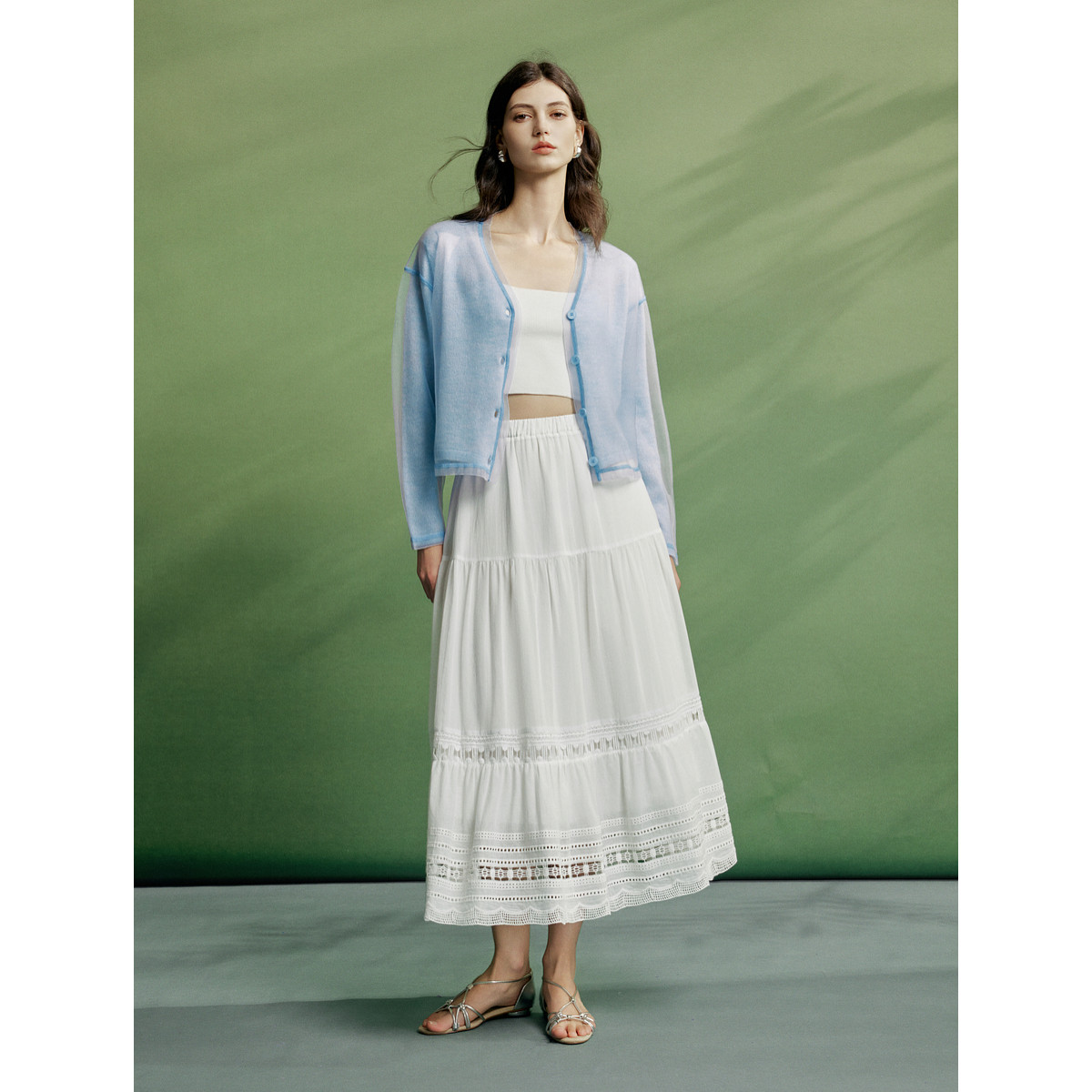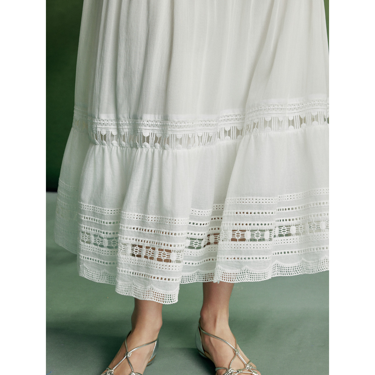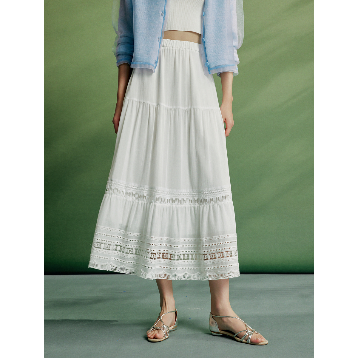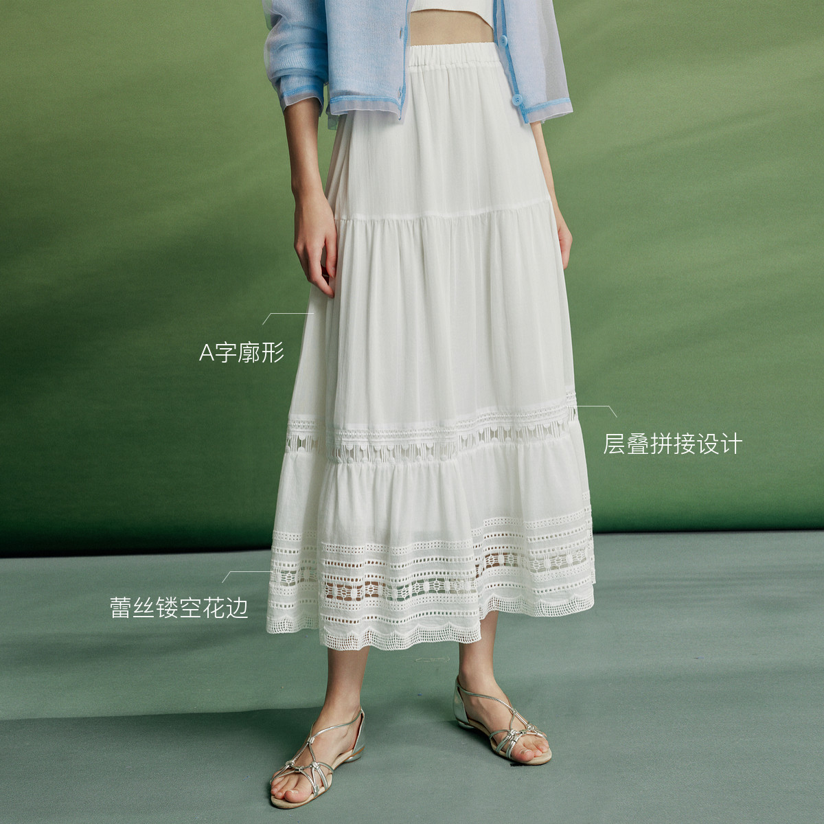 ELLE白色蕾丝镂空半身裙女2025秋新款莱赛尔天丝优雅小众a字长裙