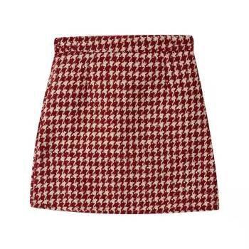 大码毛呢红色格子半身裙女秋冬天配毛衣包臀裙小香风显瘦a字短裙