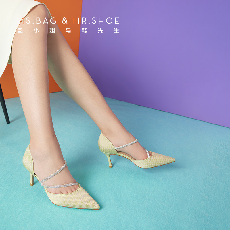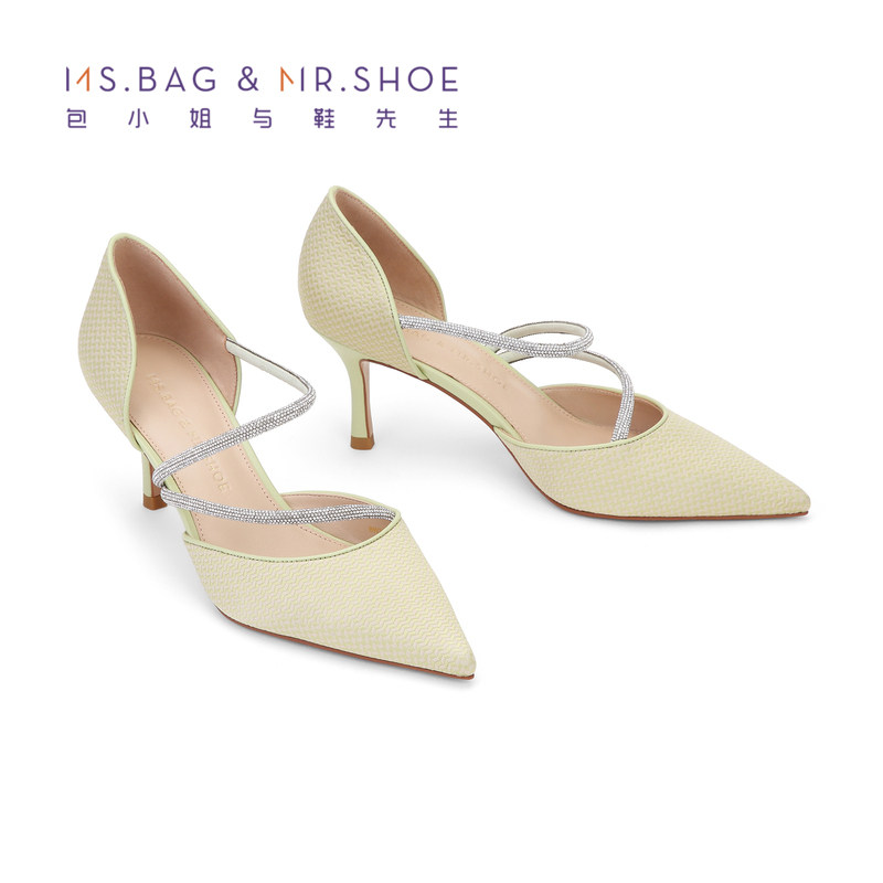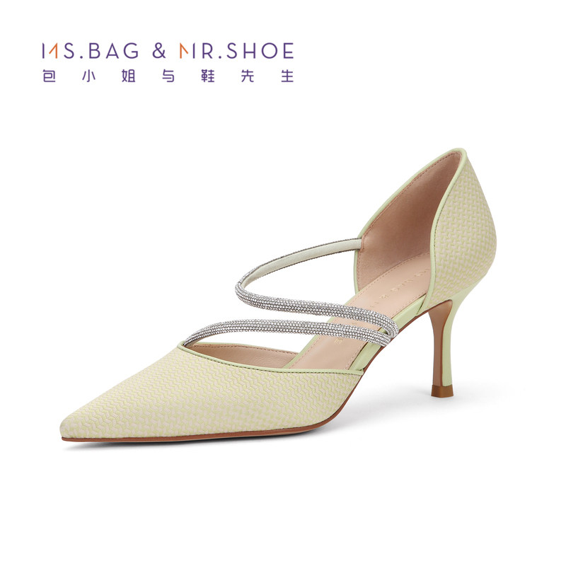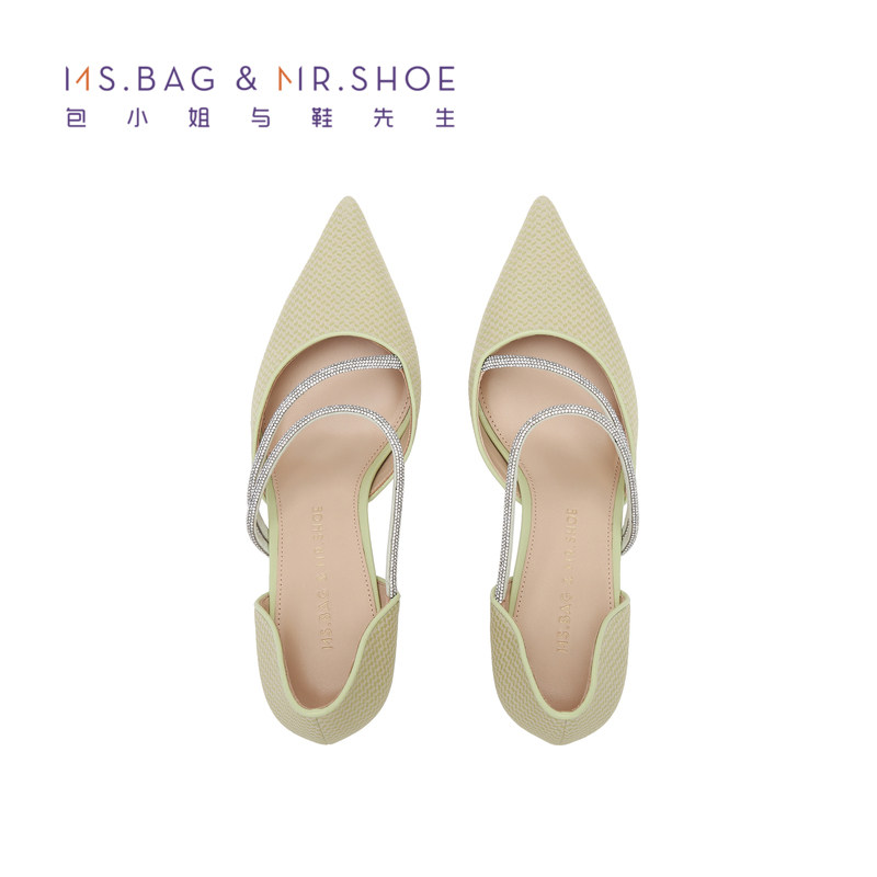 包小姐与鞋先生春夏款尖头烫水钻绑带细高跟中空凉鞋女BW232041