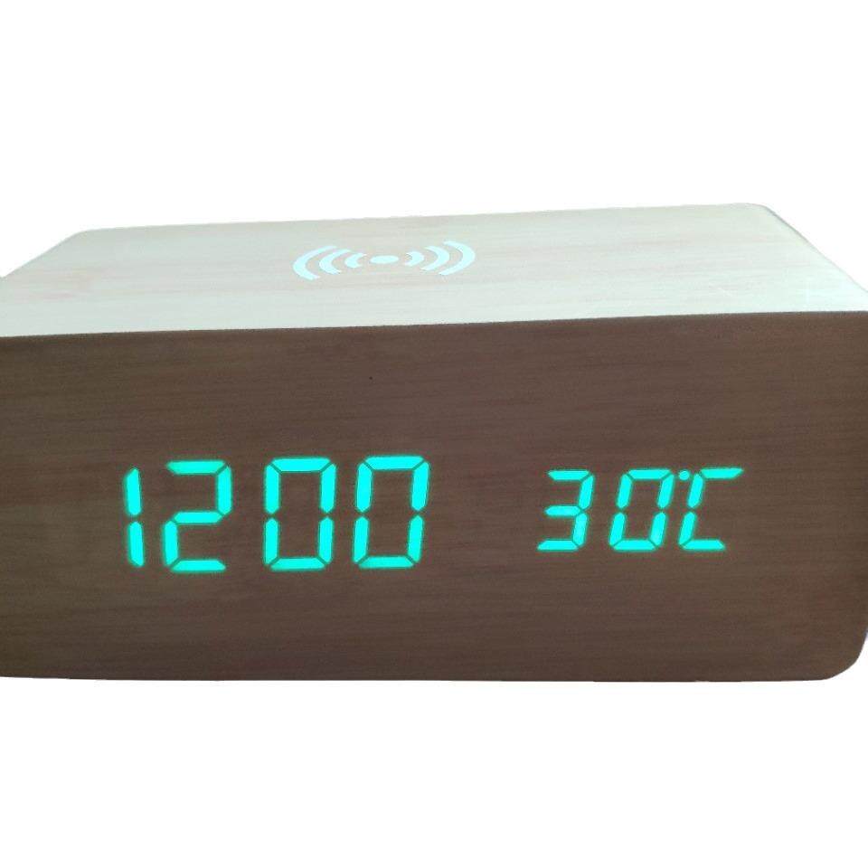 时尚创意闹钟夜光电子无线充 木质时钟温度台钟简约数字LED木头钟