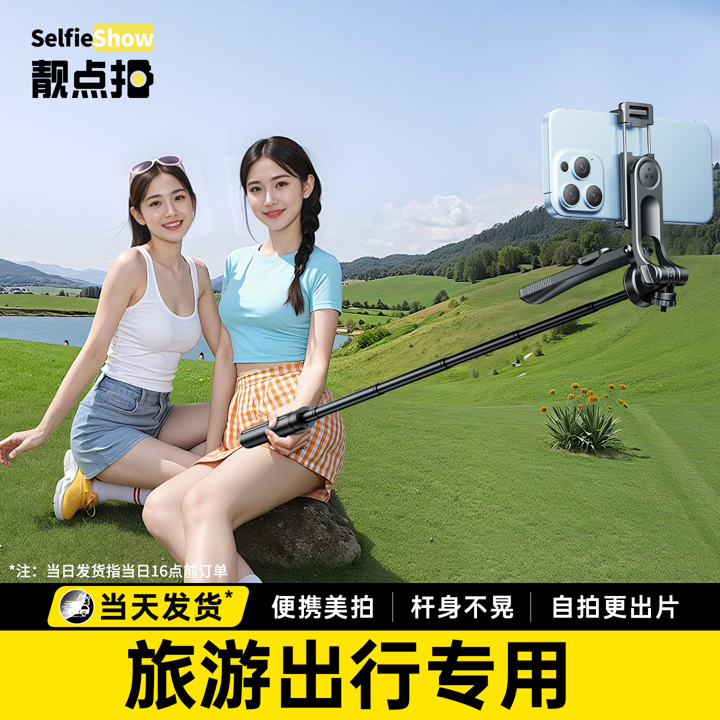 靓点拍迷你自拍杆2026新款旅游便携三脚架拍照神器通用手机360度旋转手持防抖落地稳定拍摄vlog演唱会专用