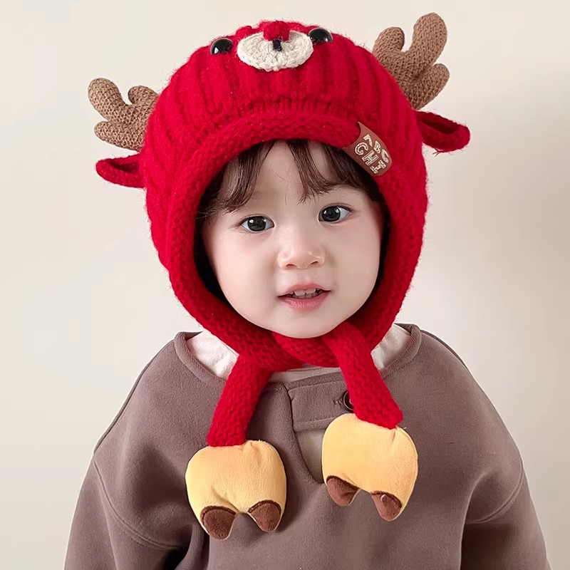 hugz儿童帽子男孩女孩保暖针织毛线帽秋冬季户外护耳防风熊仔帽子