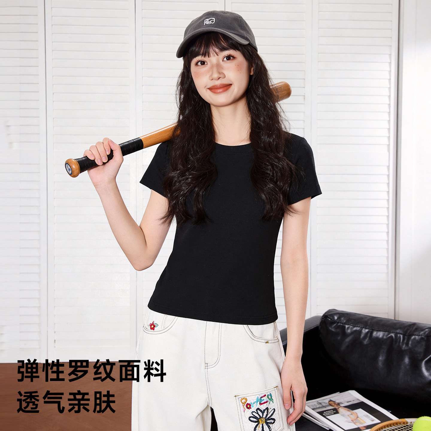 唐狮官方黑色正肩短袖t恤女夏季2026新款女士修身圆领半袖上衣VB
