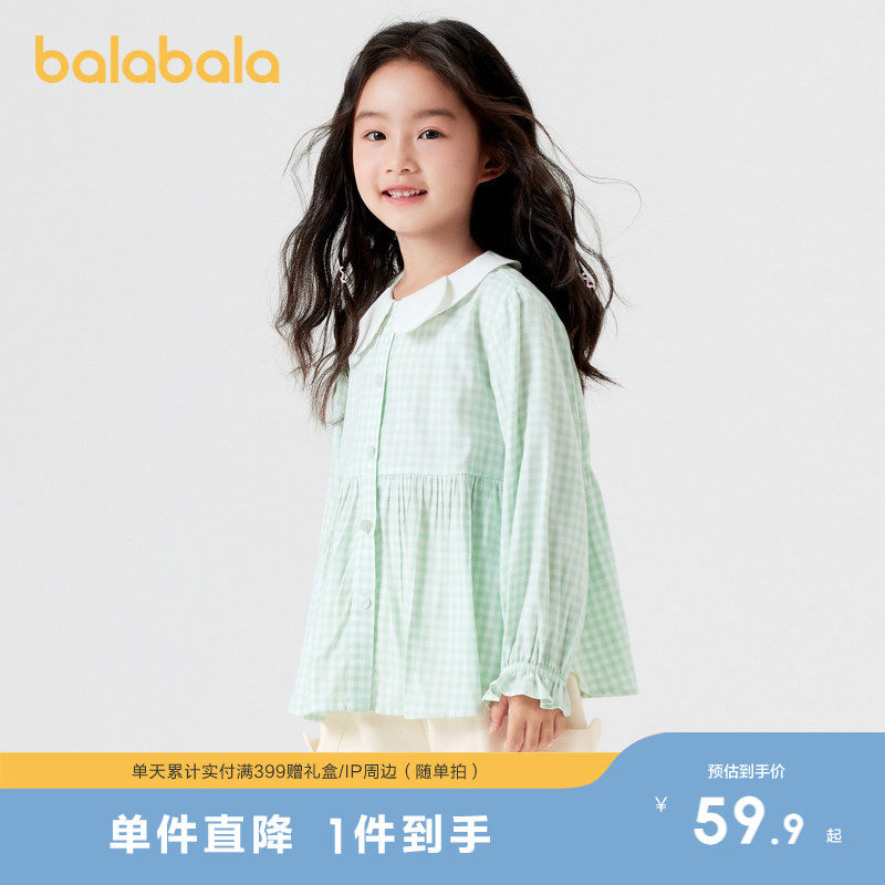 巴拉巴拉童装儿童长袖衬衫女童秋装甜美可爱文艺格子上衣小童翻领