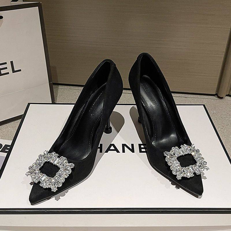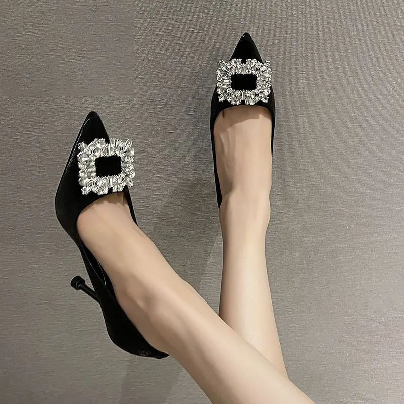 尖头时尚百搭细跟水钻方扣2025年欧美新款高跟鞋气质名媛宴会女鞋