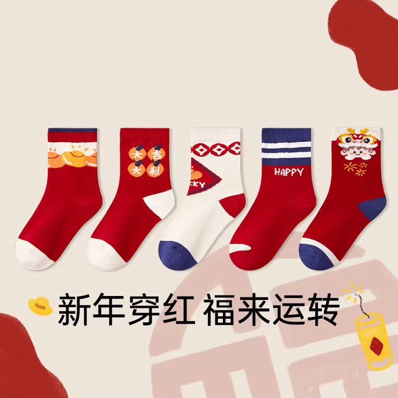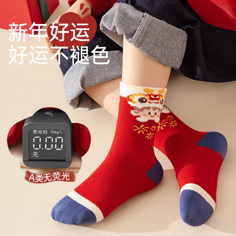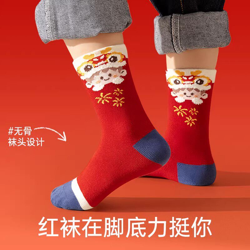 2026马年儿童袜子新年卡通男童红色棉袜新年红袜女童本命年中筒袜