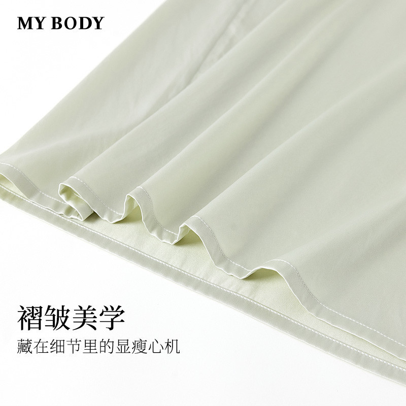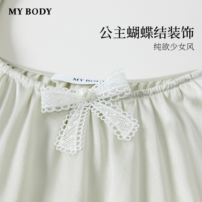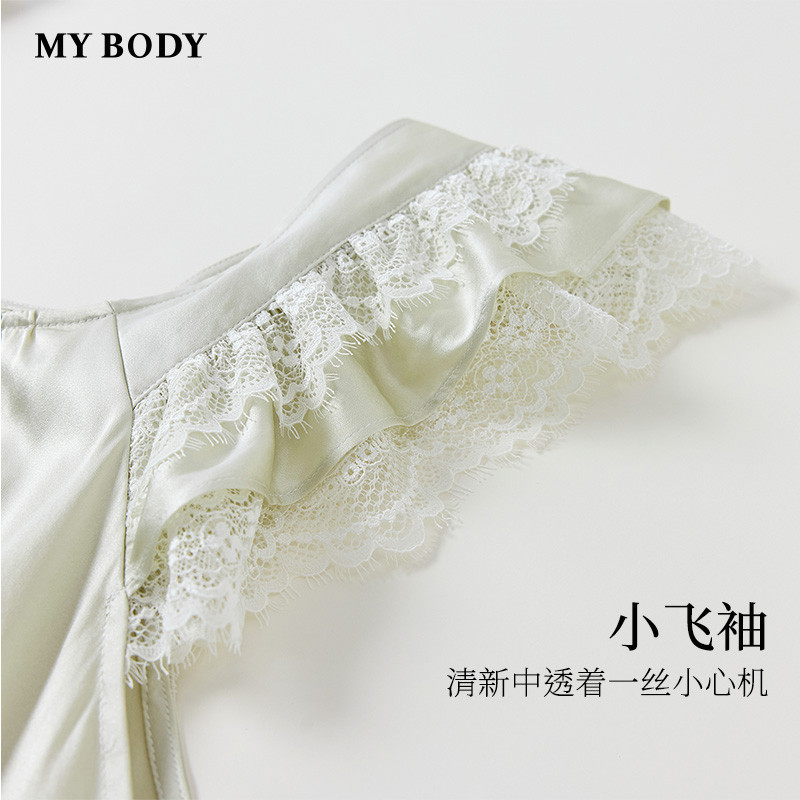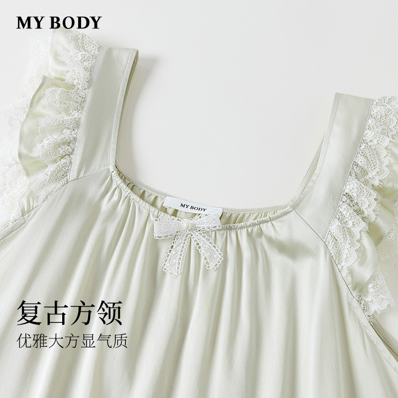 商场同款MYBODY26春季新款睡裙桑蚕丝复古方领蕾丝小飞袖吊带裙女