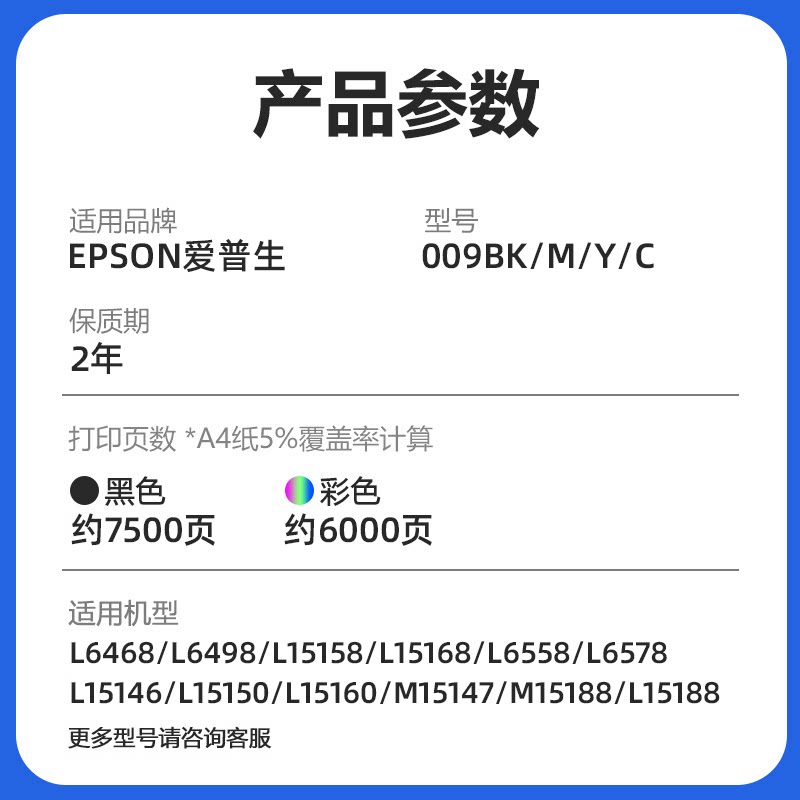 epson爱普生009原装墨水彩色打印机L15158/L15168/L6558黑色L6468