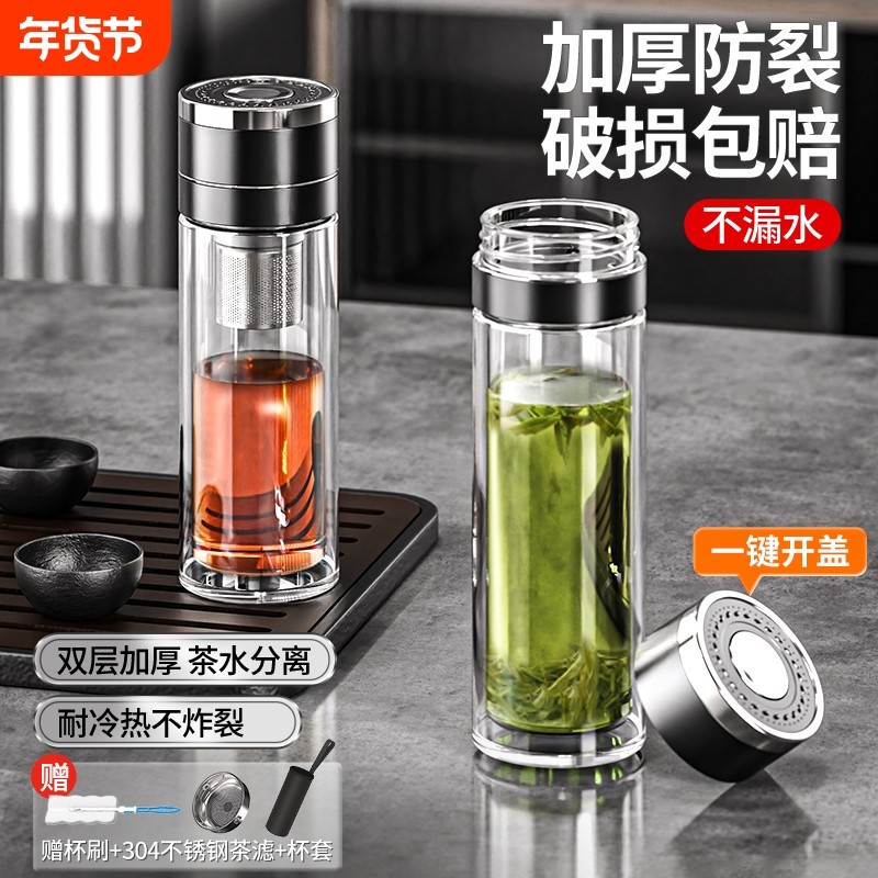 玻璃杯双层水杯大容量家用一键开盖茶杯耐高温泡茶杯子男2025新款