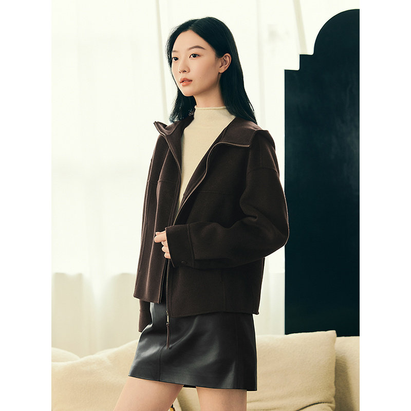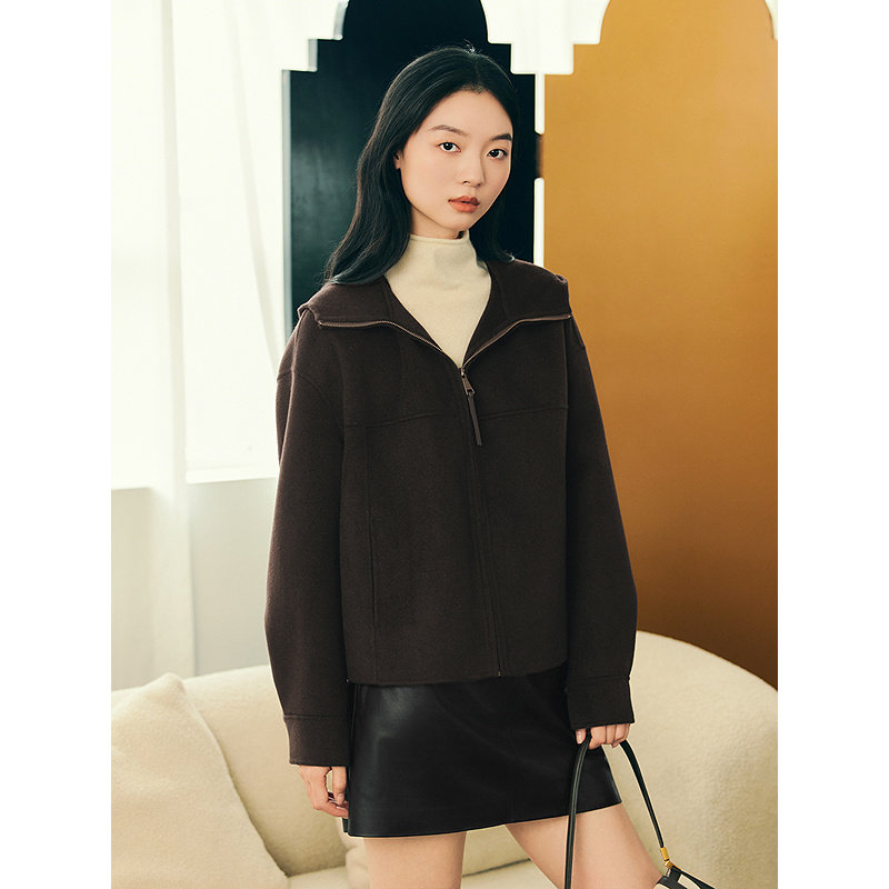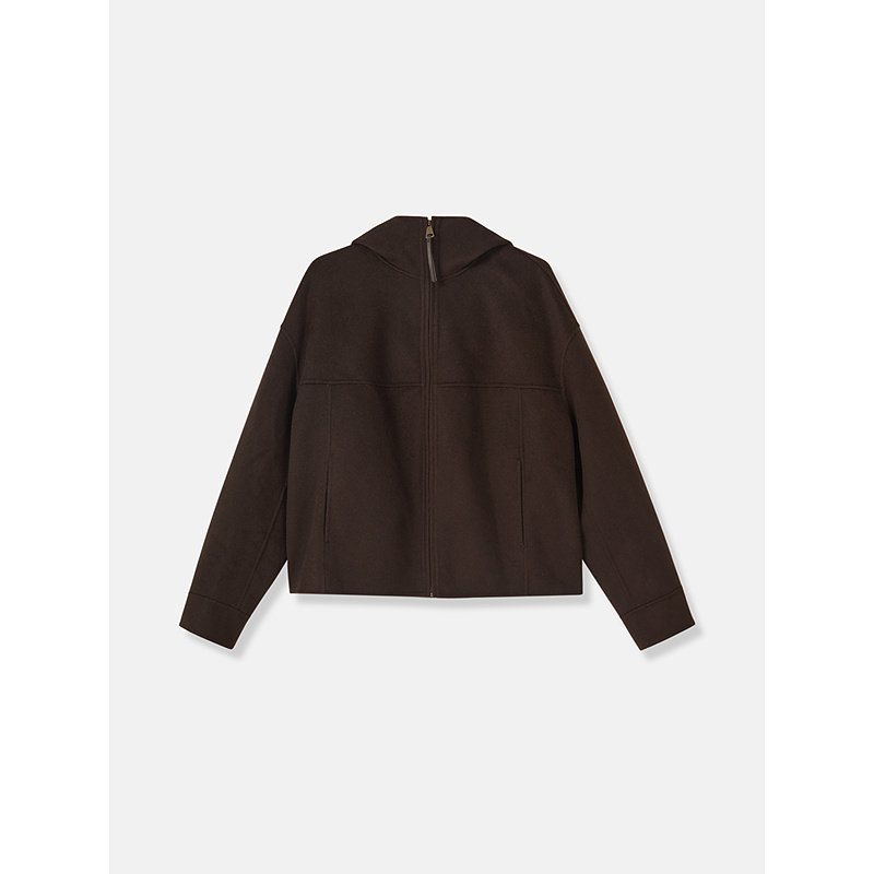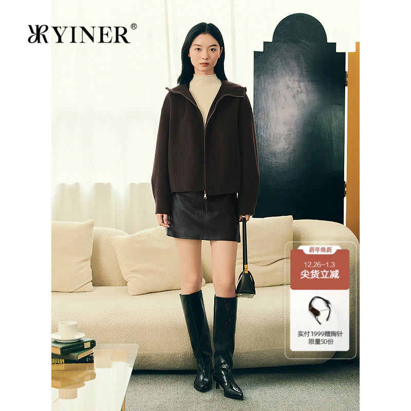 YINER音儿专选2025冬季新款法式利落羊毛羊绒混纺连帽H型短外套