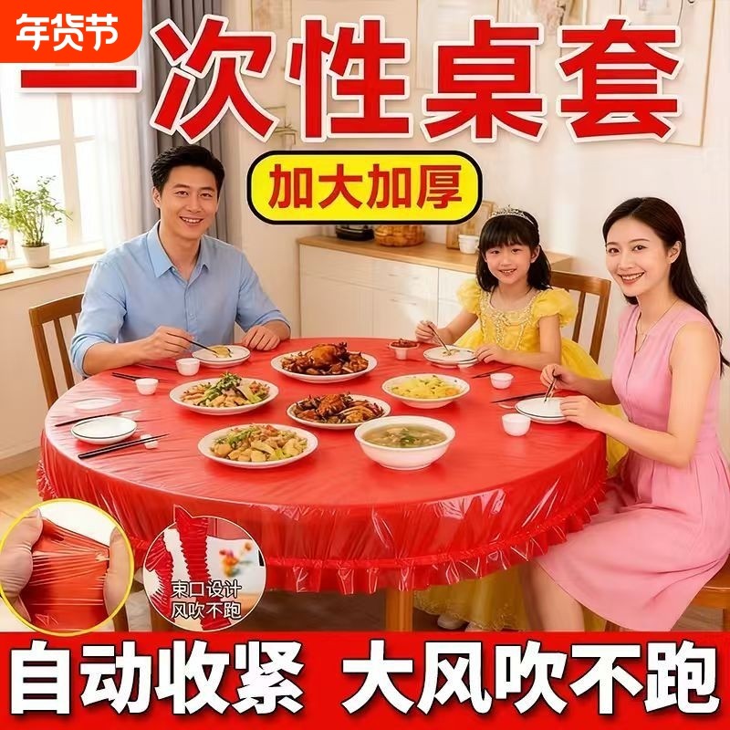 桌布一次性束口松紧带圆桌子红色塑料布薄膜结婚防水特厚乔迁防油