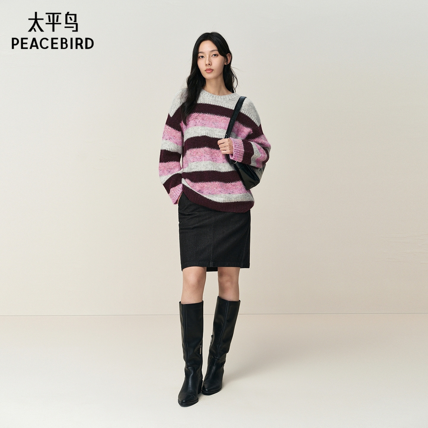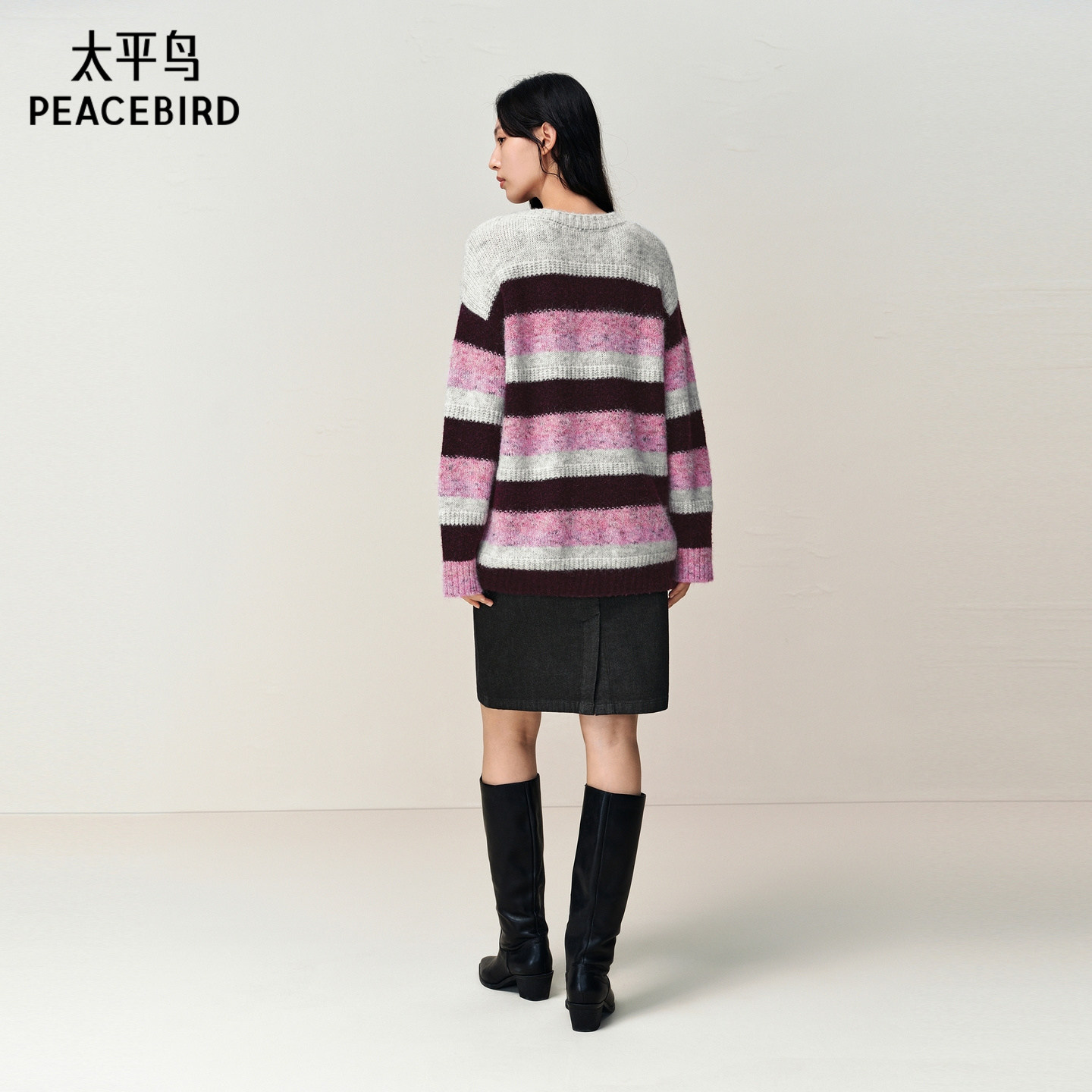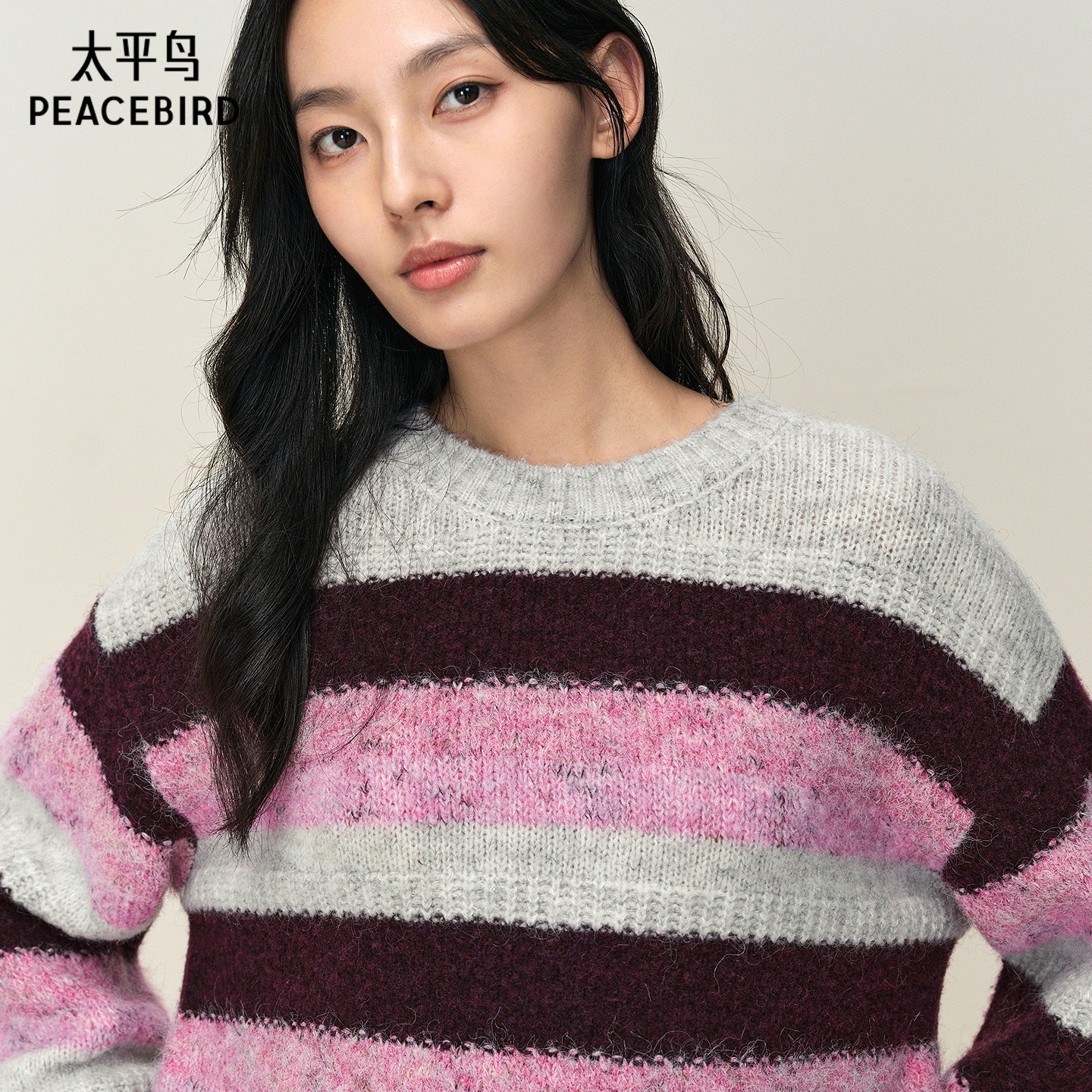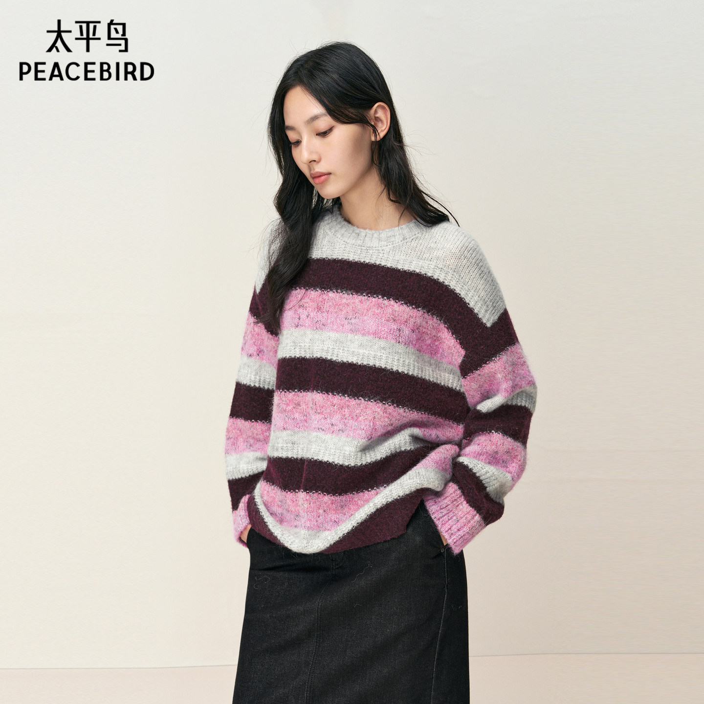【商场同款】太平鸟冬季新款马海毛混纺宽松条纹针织衫A3EEF4614