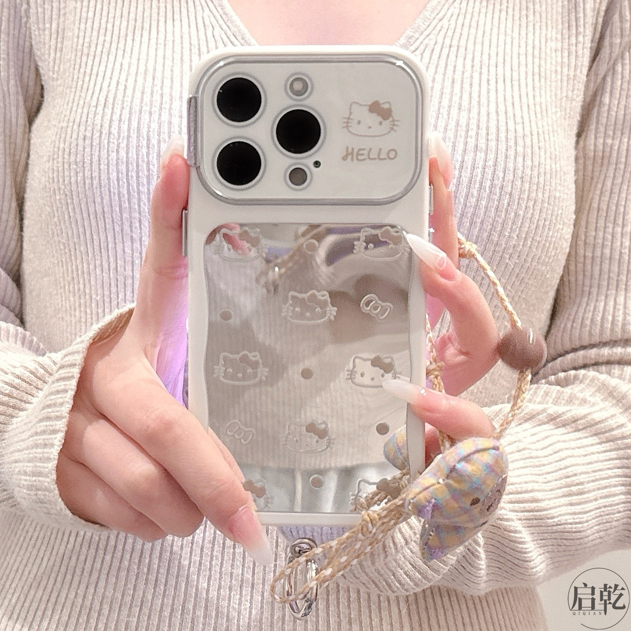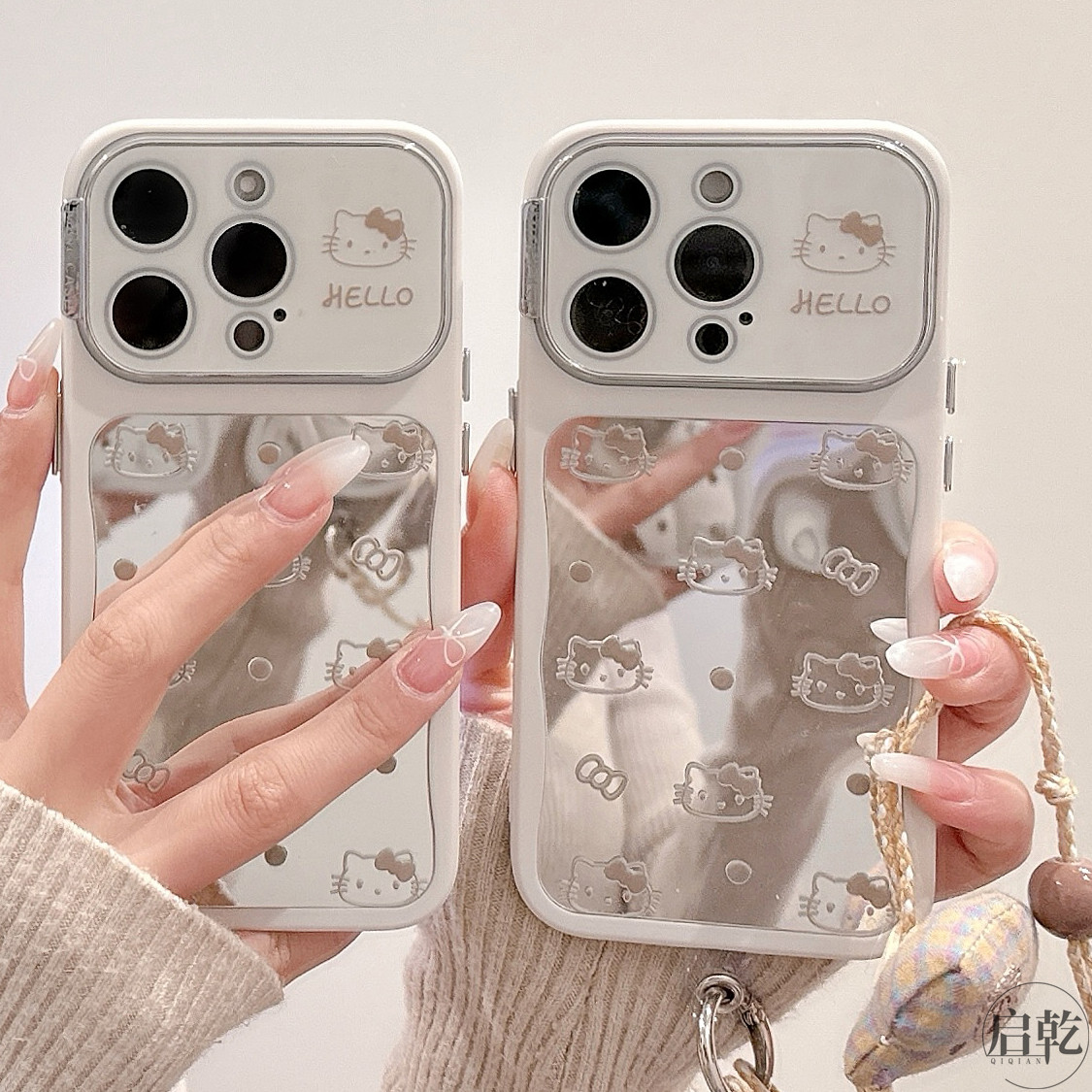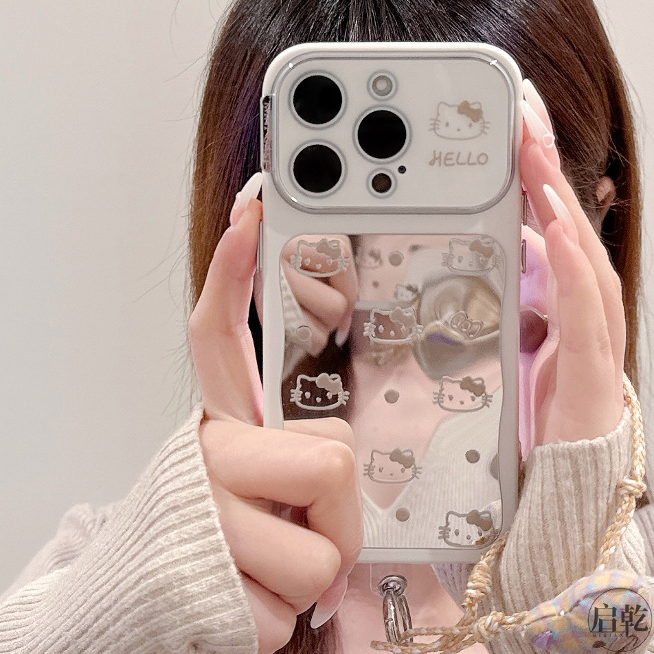 启乾 镜面波点猫咪腕带iPhone16/15手机壳适用苹果14/13promax自带镜头膜软壳链条挂绳新款少女心镜子日韩ins