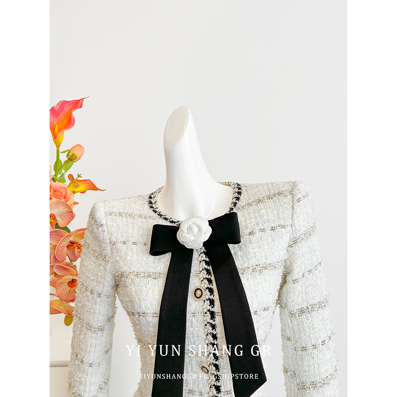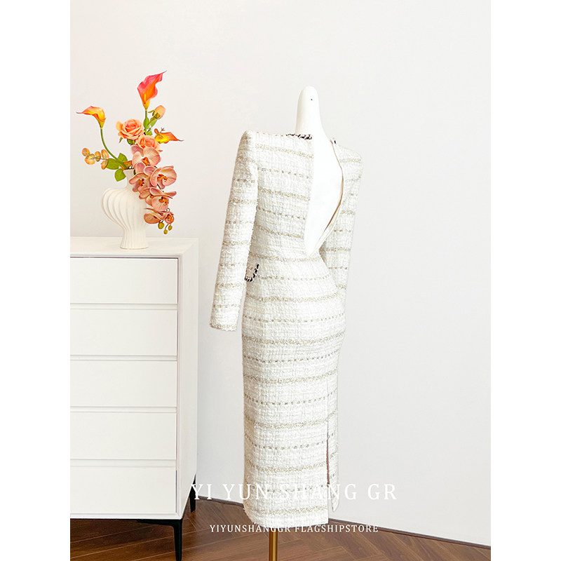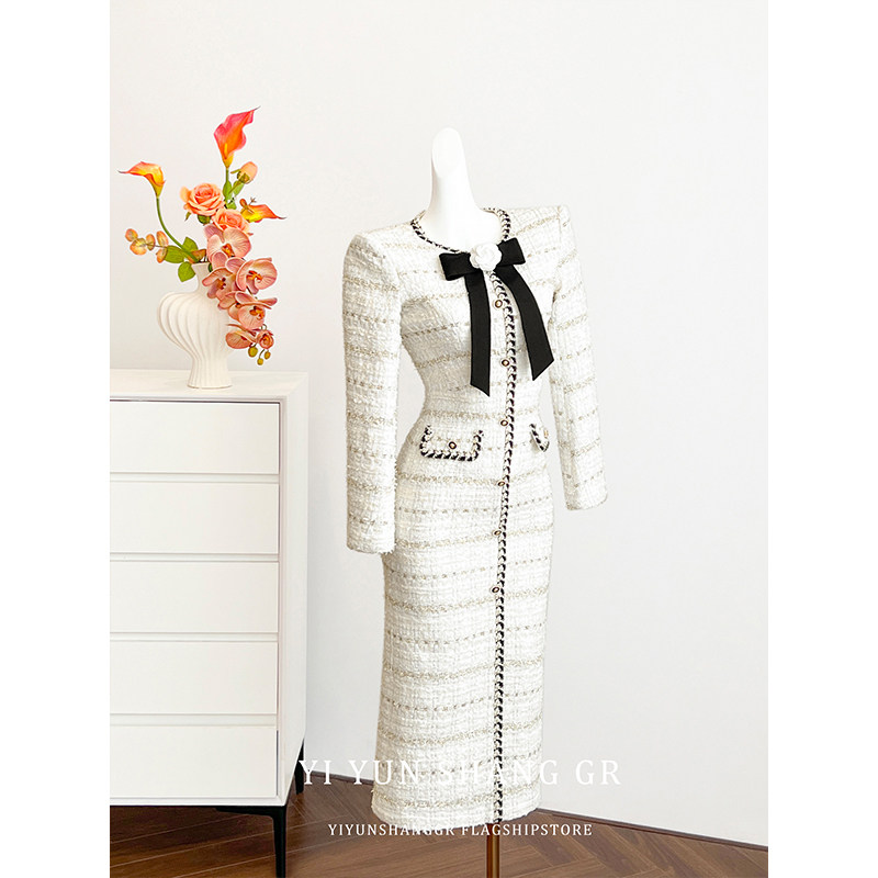 白色复古小香风连衣裙女冬季长裙法式小个子气质高端宴会礼服裙子