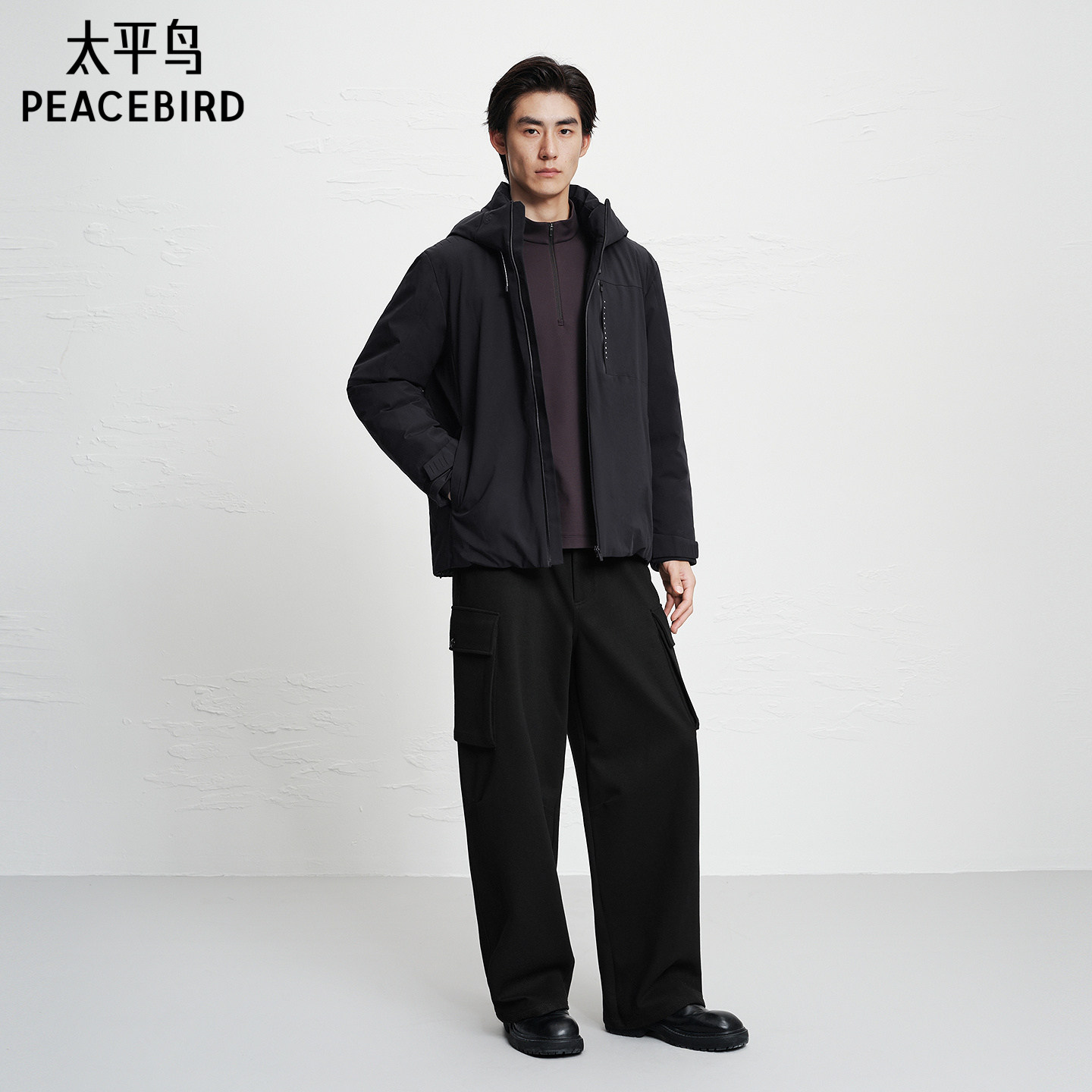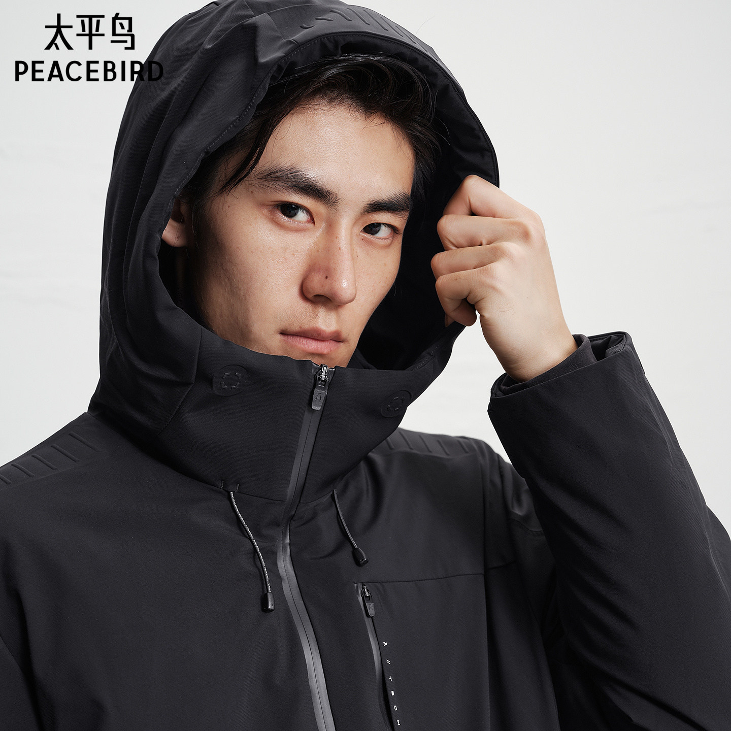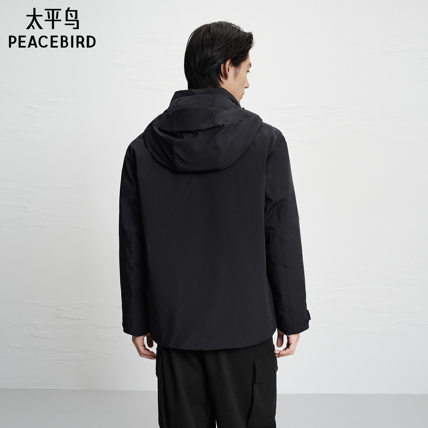 太平鸟男装 黑色保暖防寒服男冬季潮流户外工装连帽羽绒服男