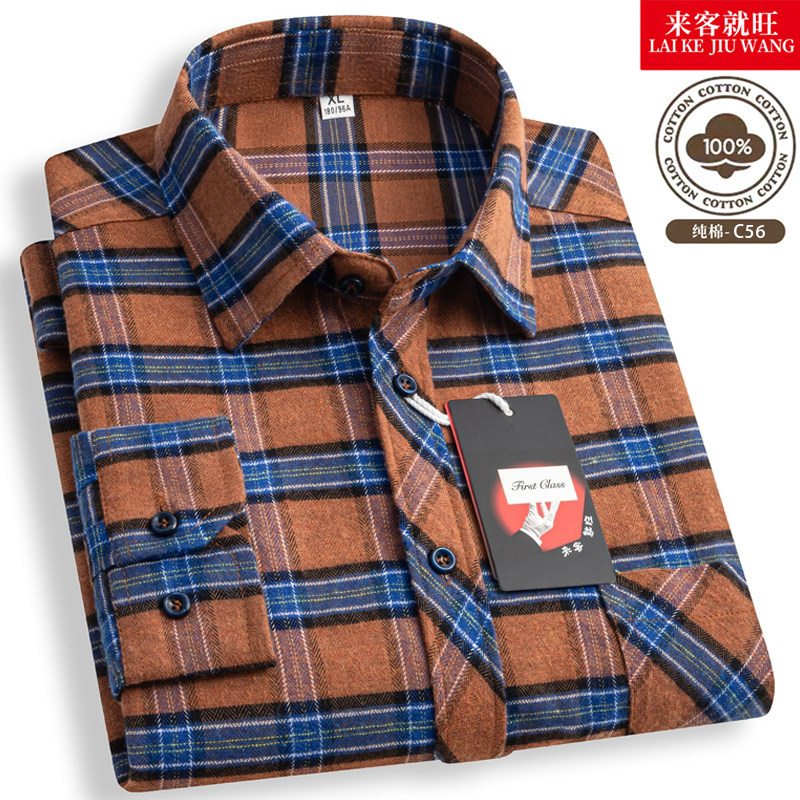 啄木鸟秋季新款男士长袖100%全纯棉磨毛格子衬衫 高级感休闲衬衣