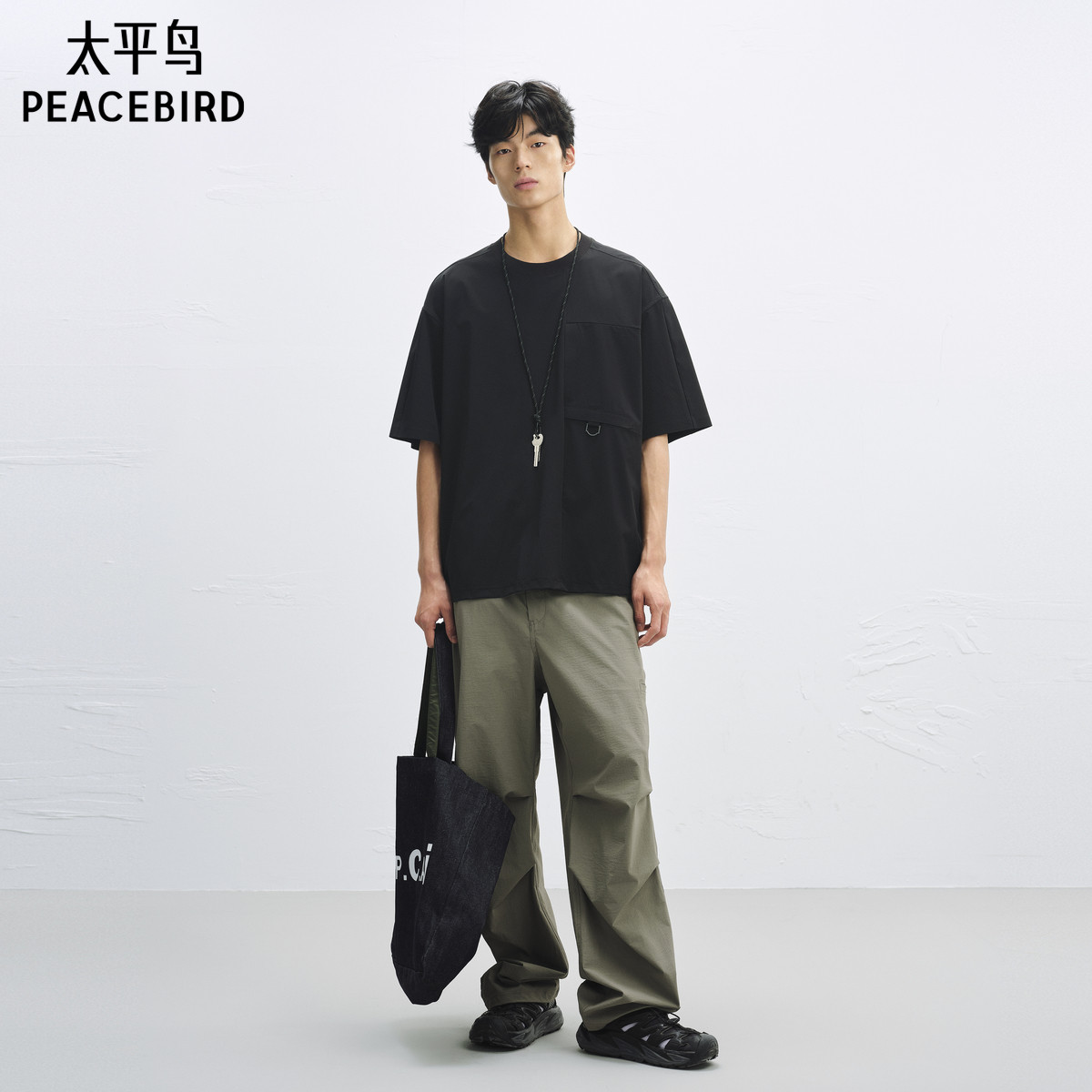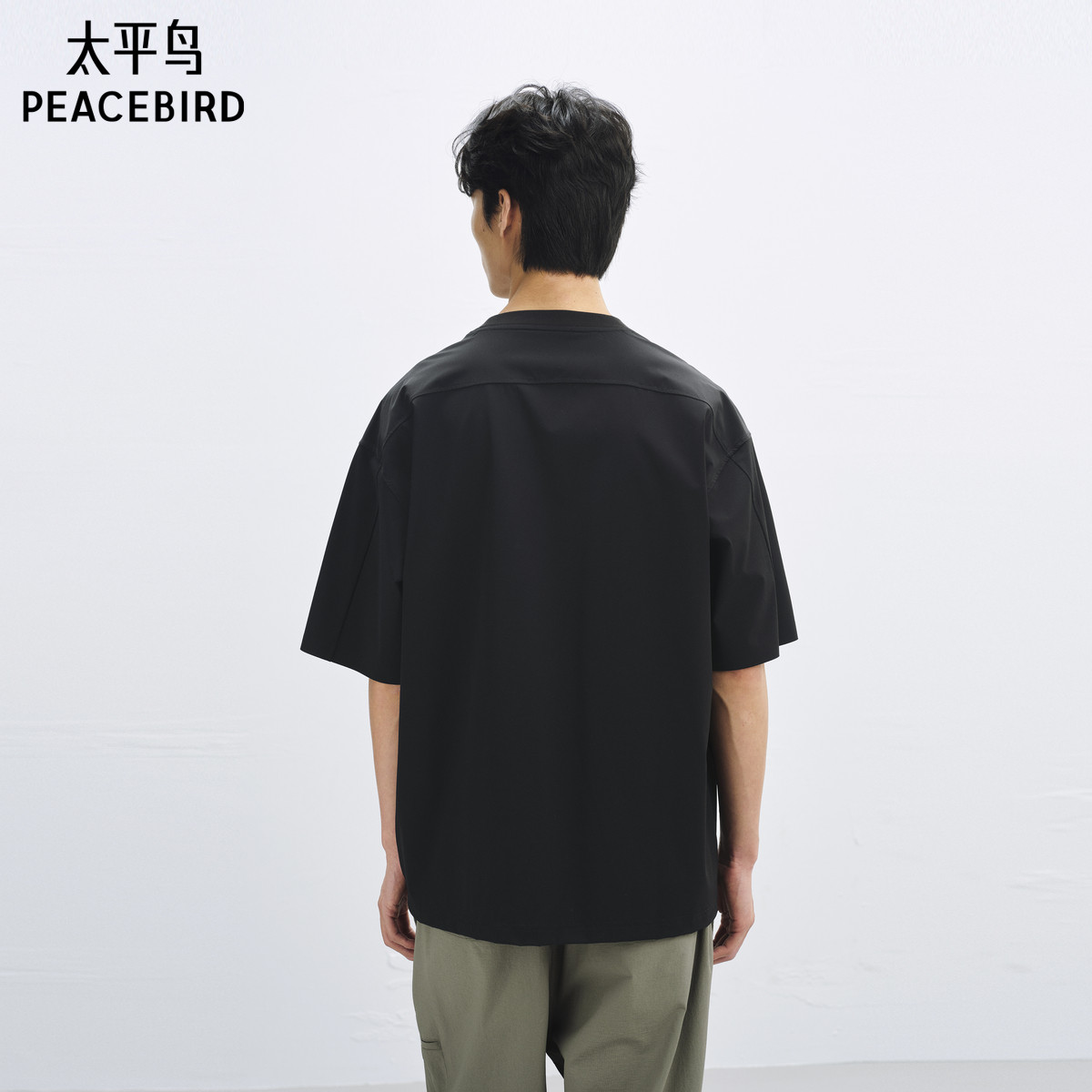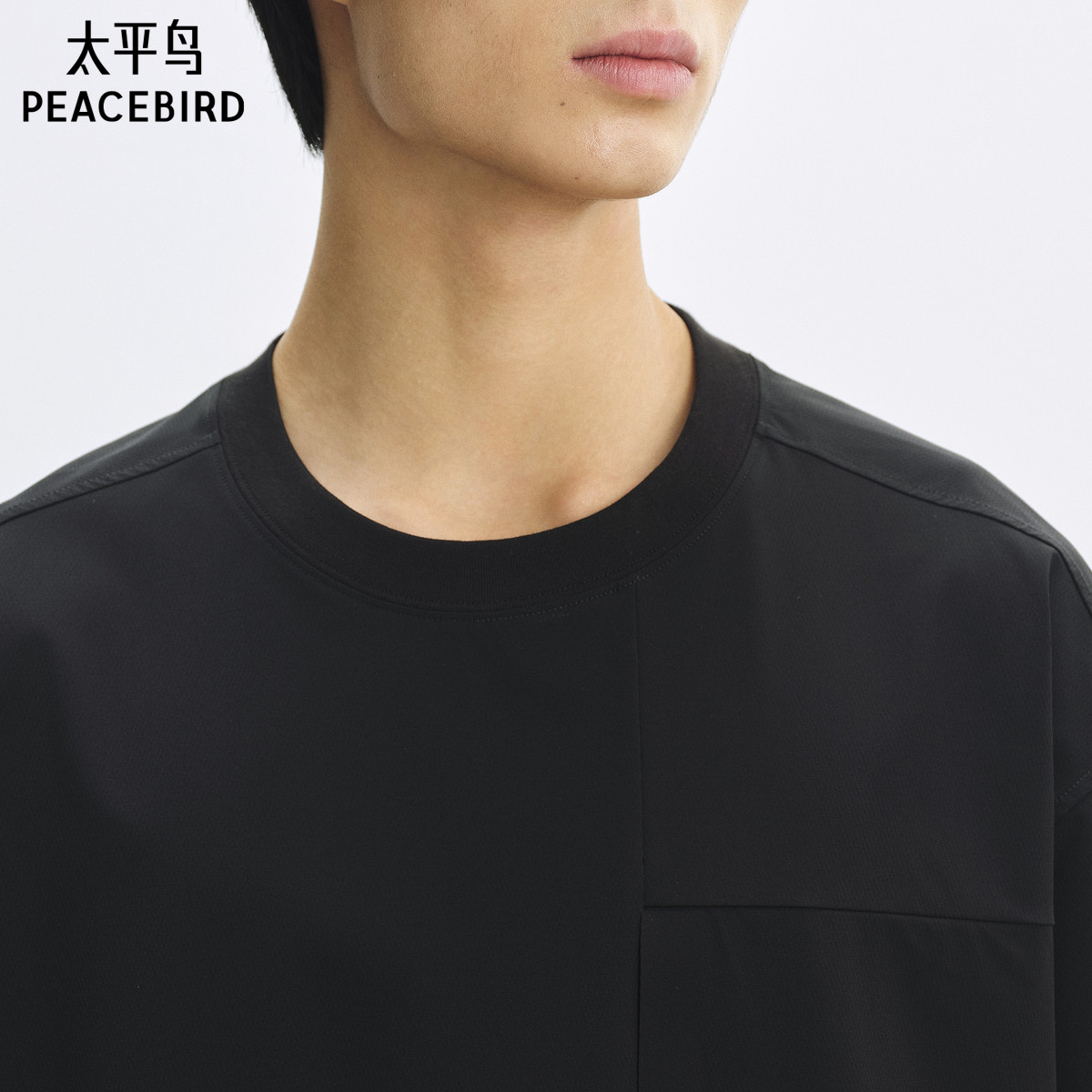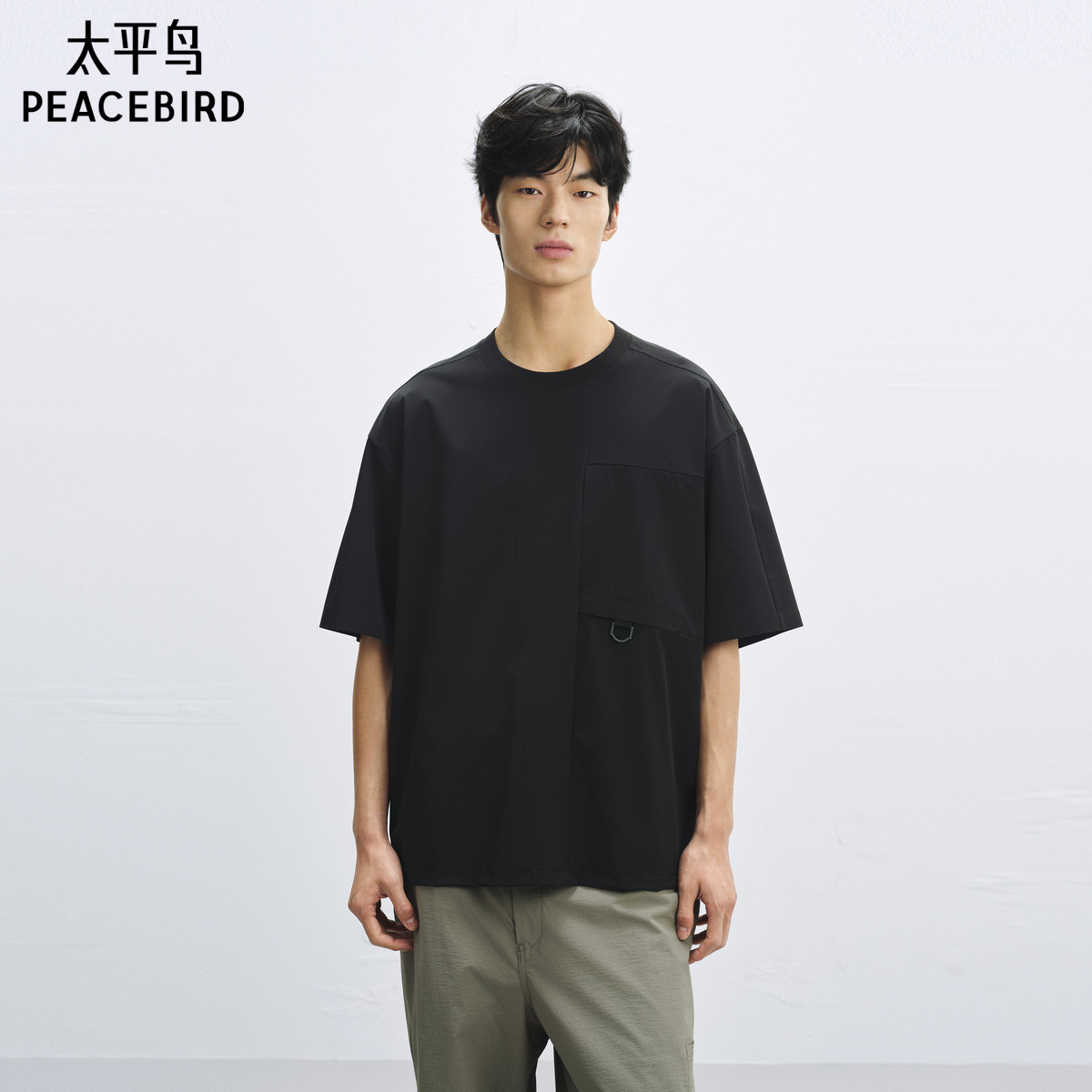 太平鸟男装户外口袋短袖T恤25夏季新款拼接宽松重磅体恤衫潮牌黑t