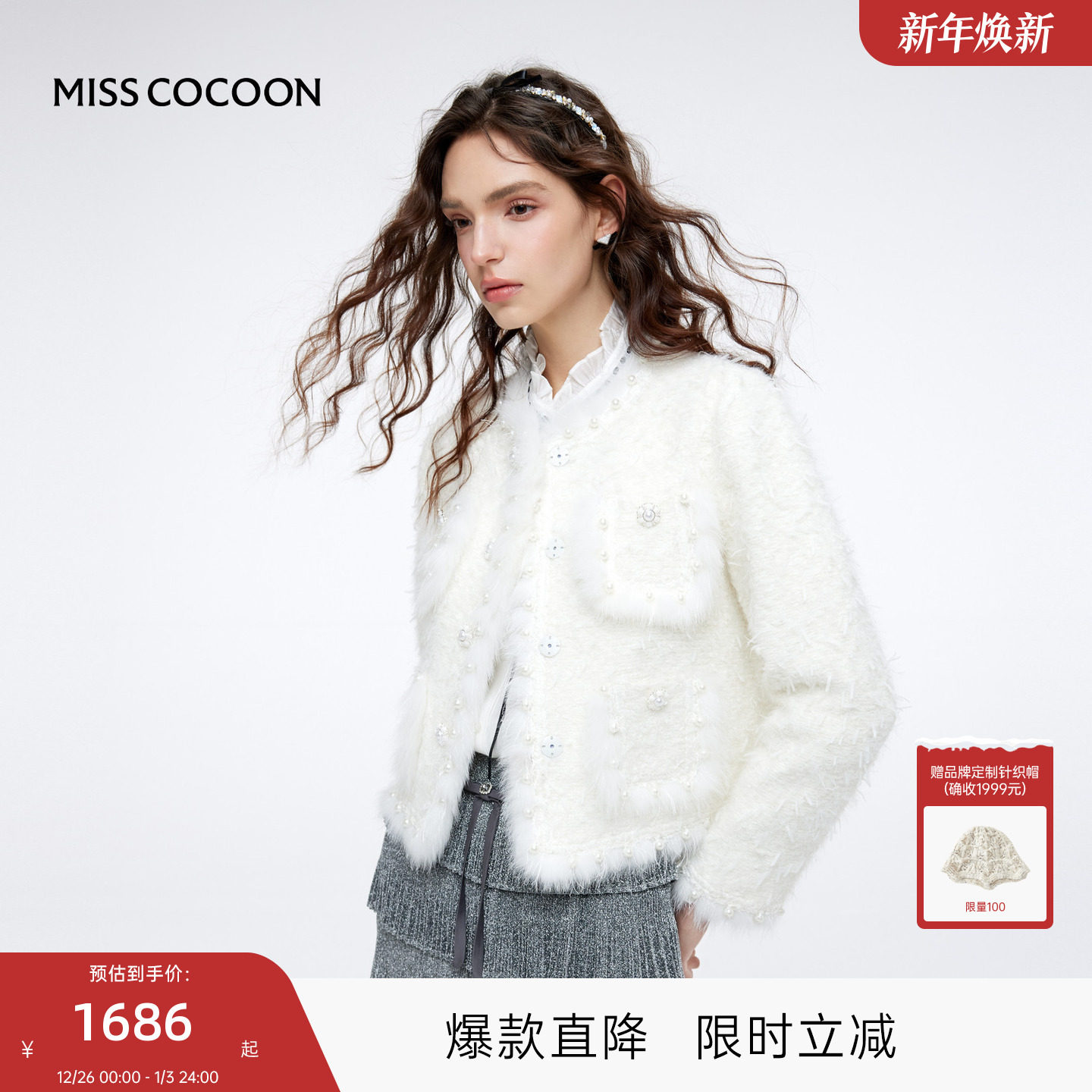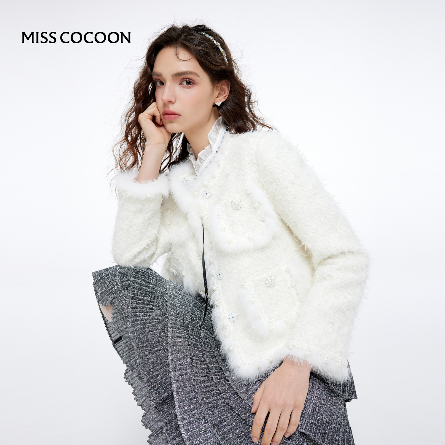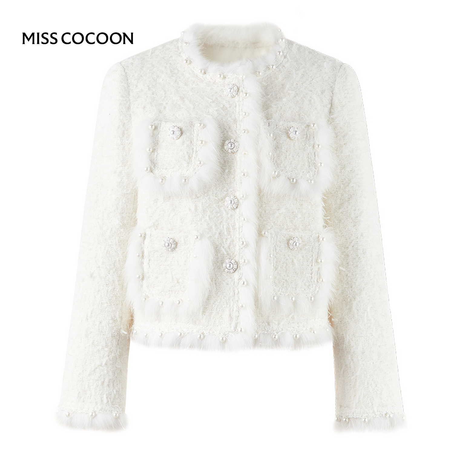 MISSCOCOON可可尼修身白色2025冬新款千金小香风狐狸毛短款外套女