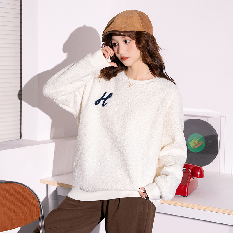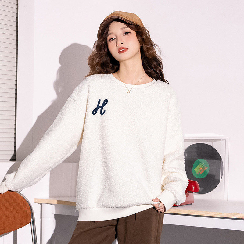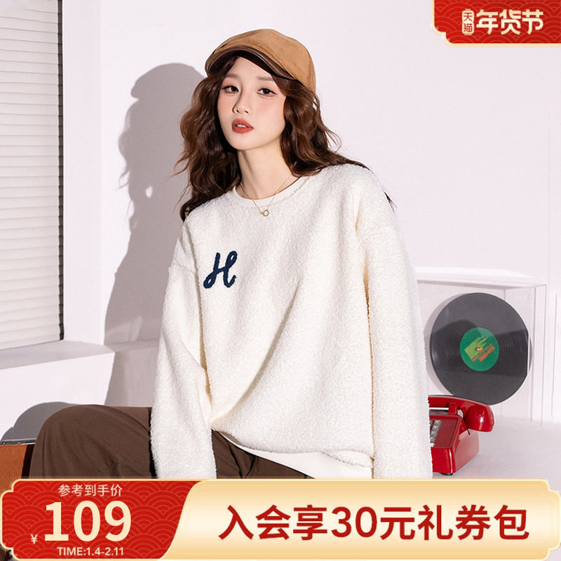 热风女士仿羊羔绒可爱圆领卫衣女秋冬加绒校园风字母刺绣保暖内搭