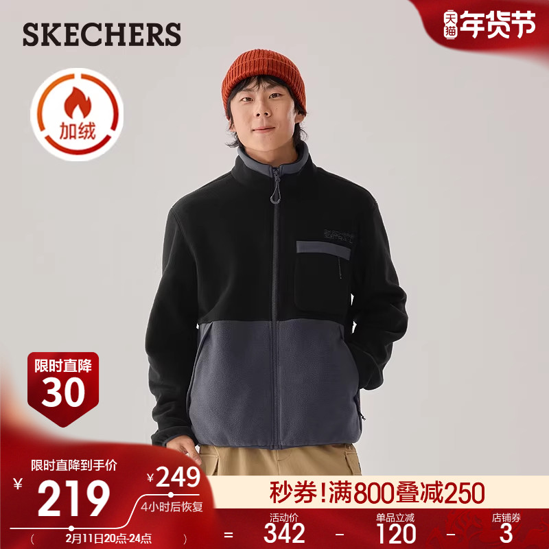 斯凯奇冬季男款摇粒绒外套舒适保暖抗静电拼接休闲运动风拉链长袖