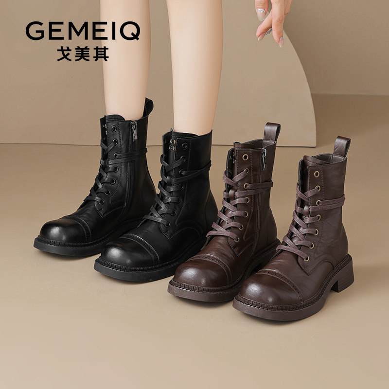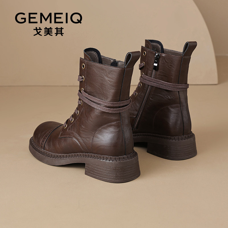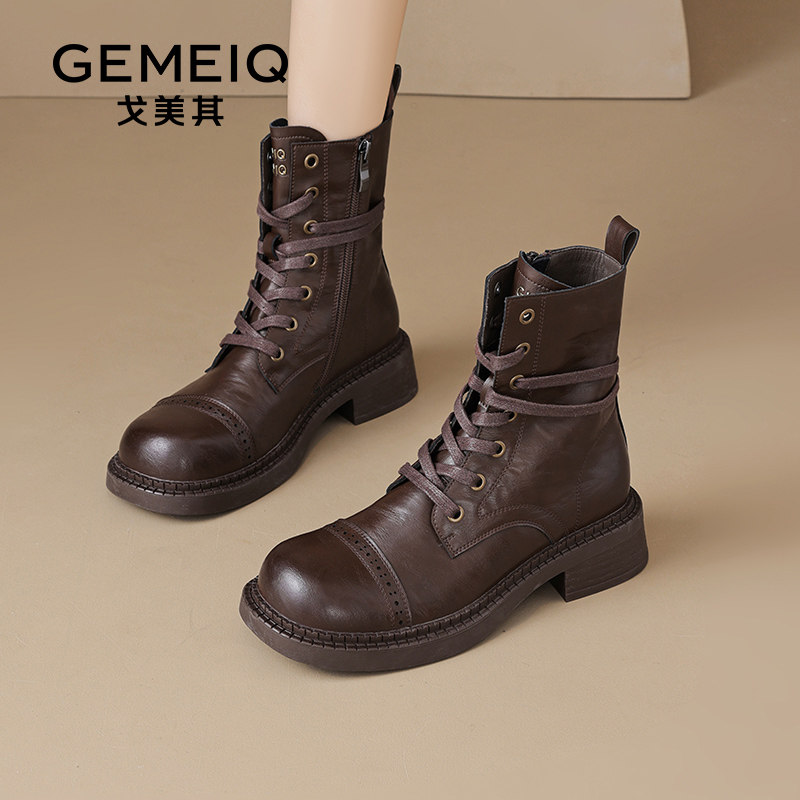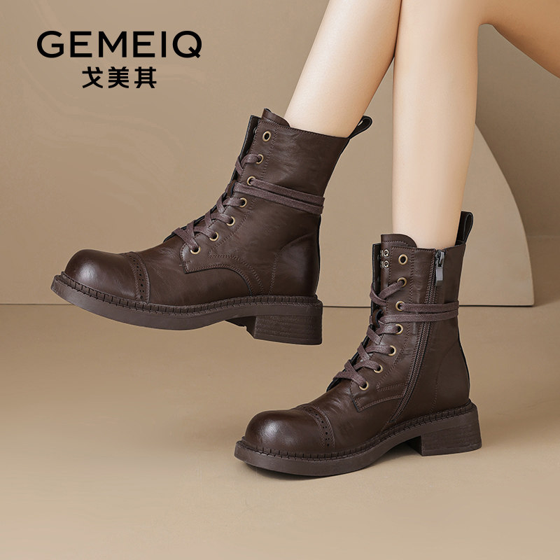 戈美其棕色靴子马丁靴女舒适新款春秋季雅丹风绑带潮酷机车靴短靴