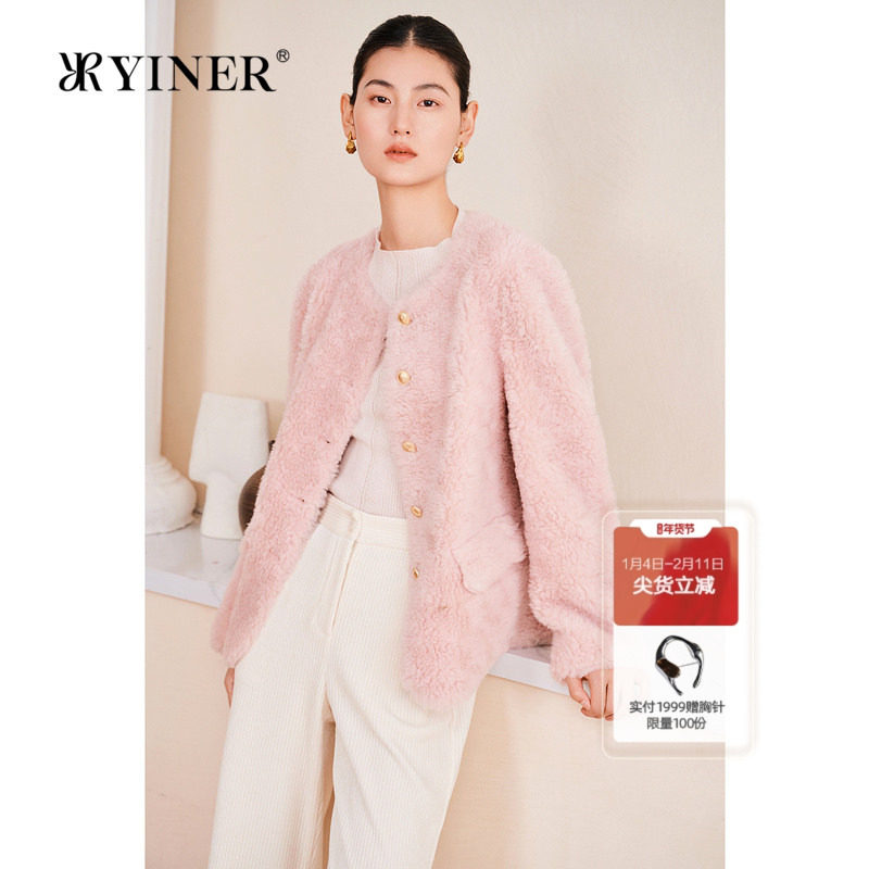 YINER音儿专选2025春季新款小香风珊瑚粉保暖环保羊毛皮草外套