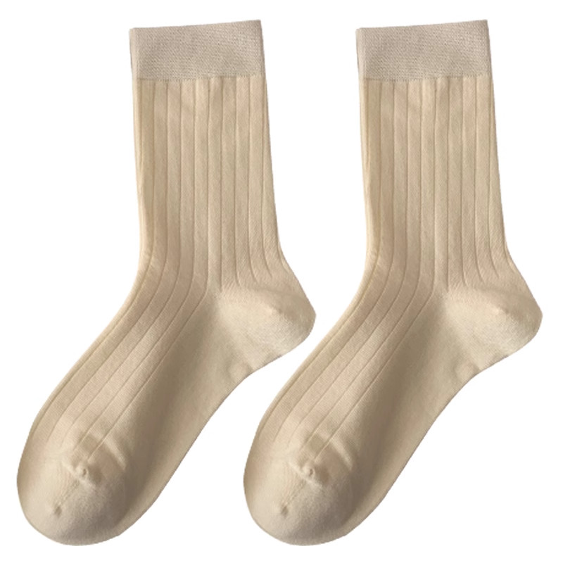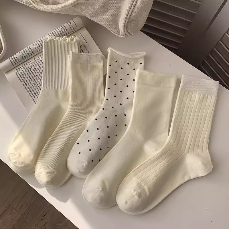 奶白色袜子女款纯棉中筒袜春夏百搭纯色长袜韩版波点木耳边堆堆袜
