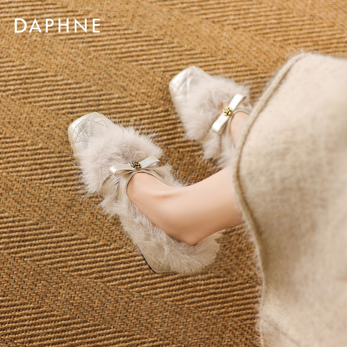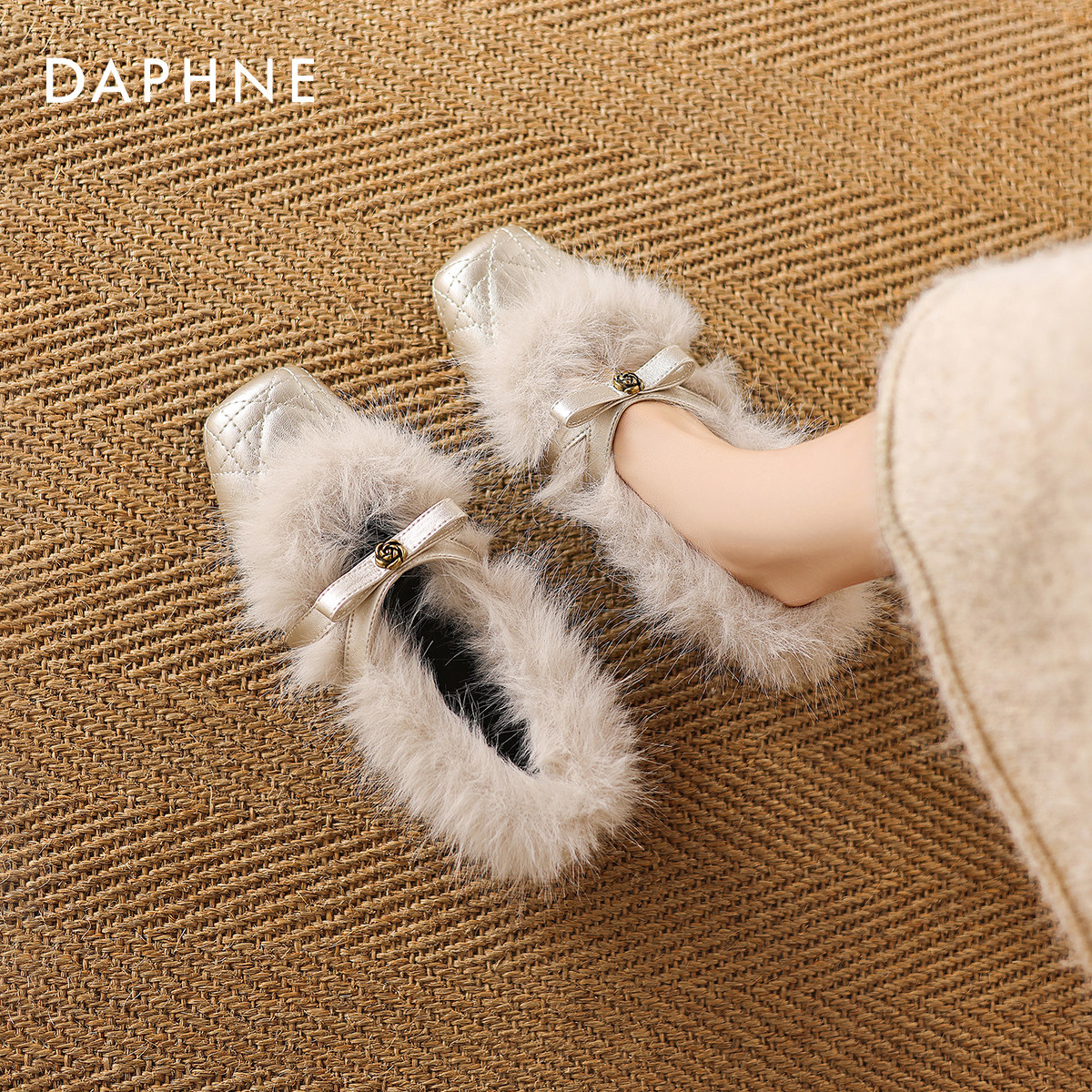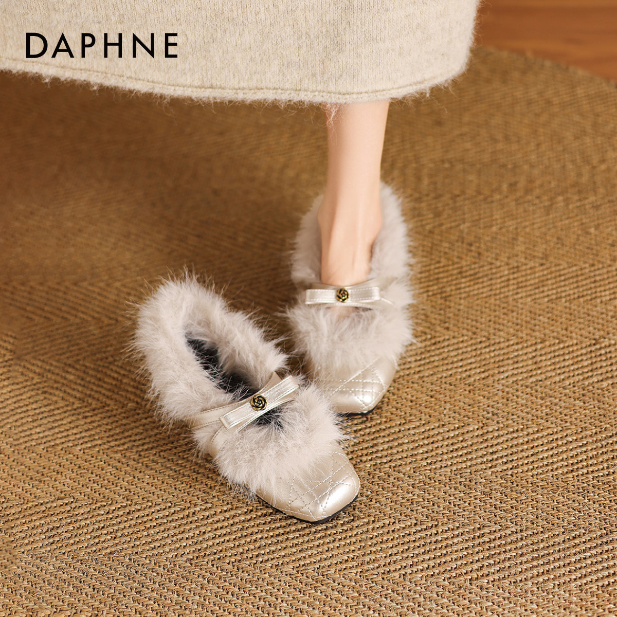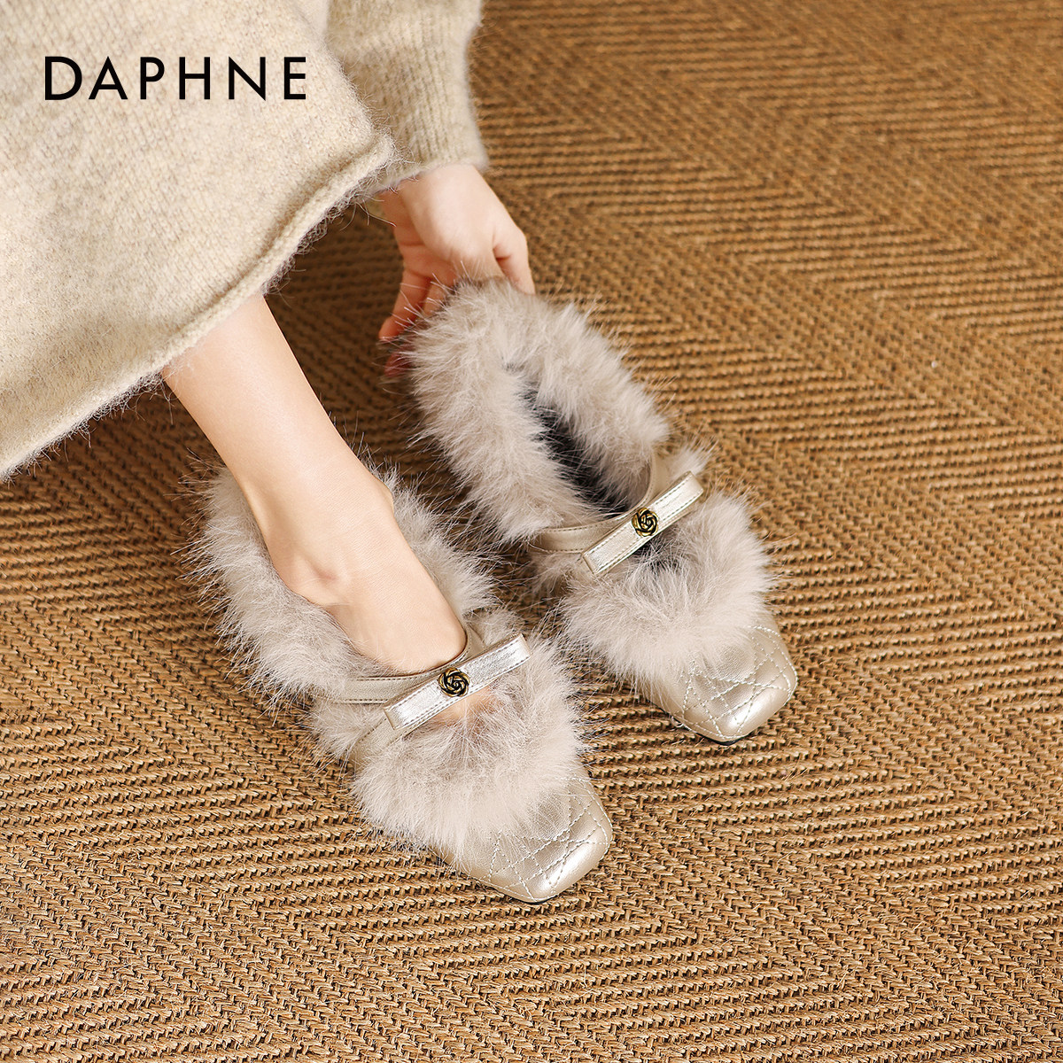 达芙妮山茶花单鞋女2026新款春季加绒玛丽珍毛毛鞋平底方头小皮鞋