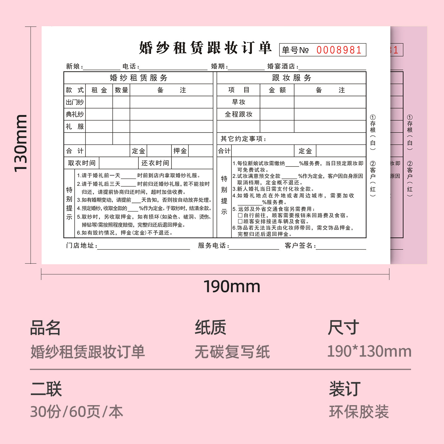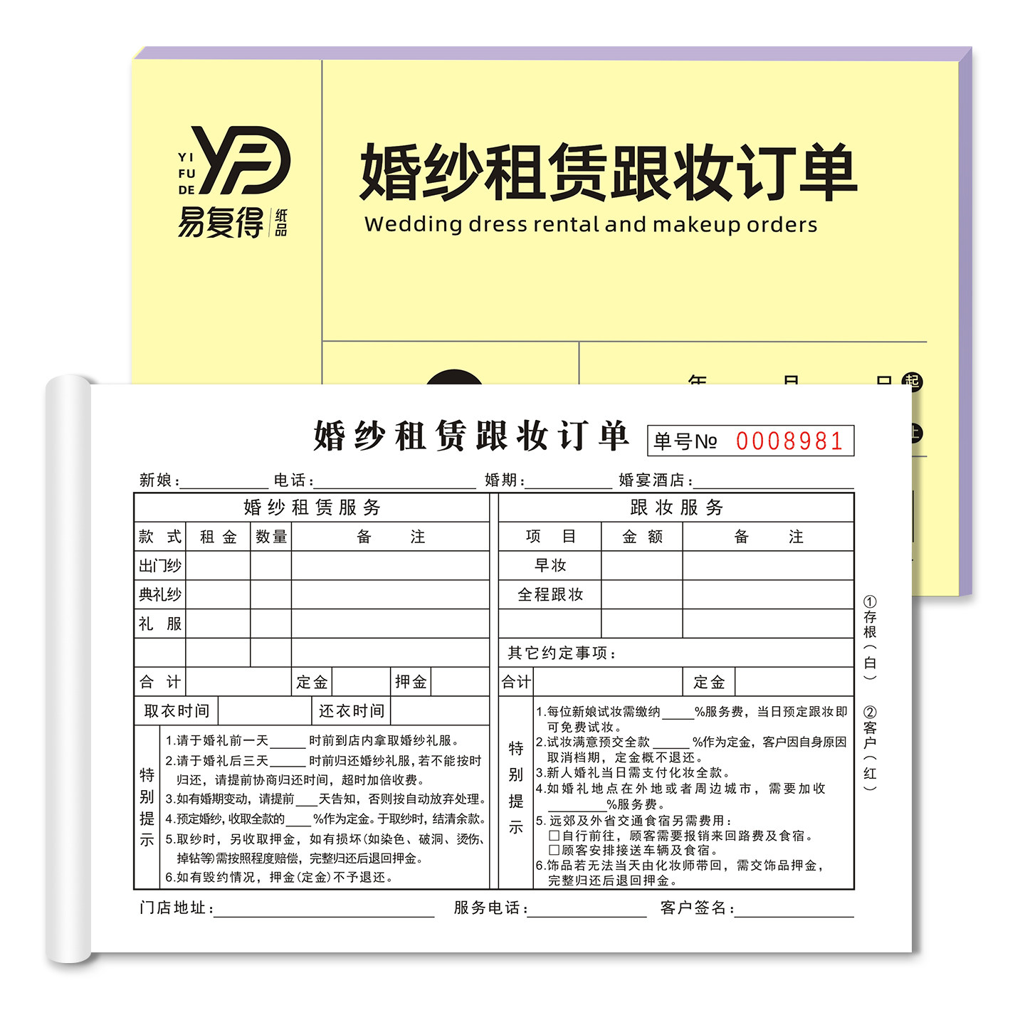 婚纱租赁跟妆订单二联婚纱店跟妆单礼服造型租赁摄影服装订单收据