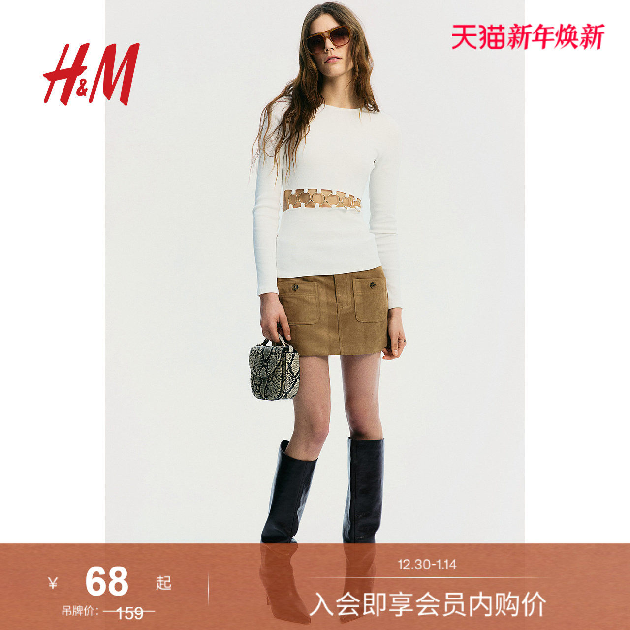 HM女装T恤冬季棉质罗纹镂空短上衣圆领长袖修身版打底衫1273157