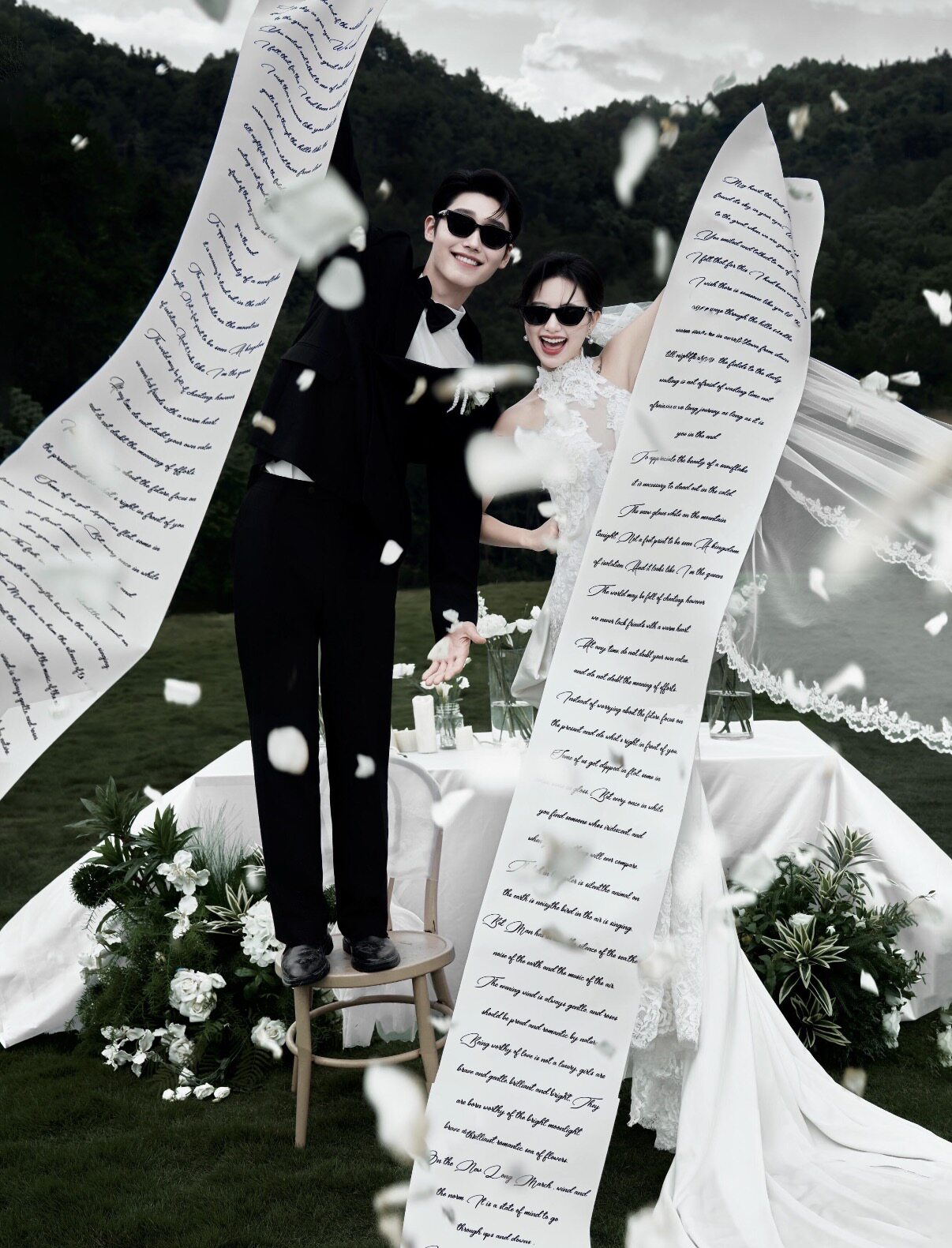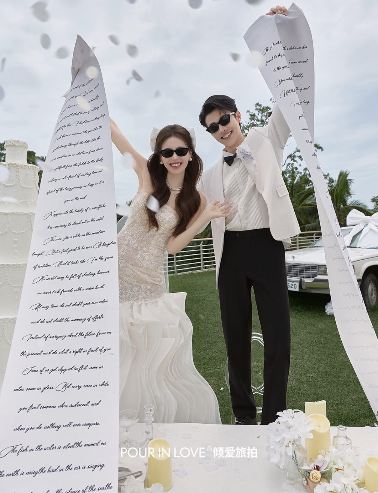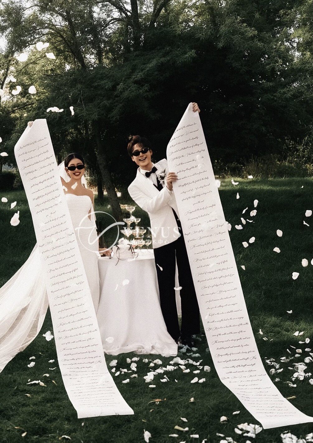 小红书流行仪式感婚纱摄影道具草坪婚礼拍照英文誓言布香槟塔酒瓶