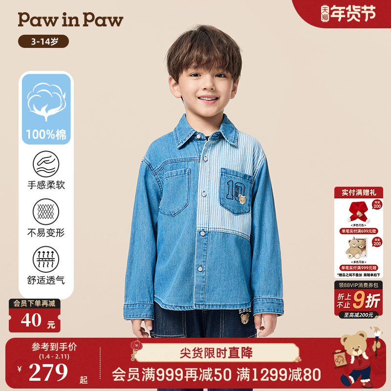 【商场同款】PawinPaw卡通小熊童装25年秋季新款男童牛仔长袖衬衫