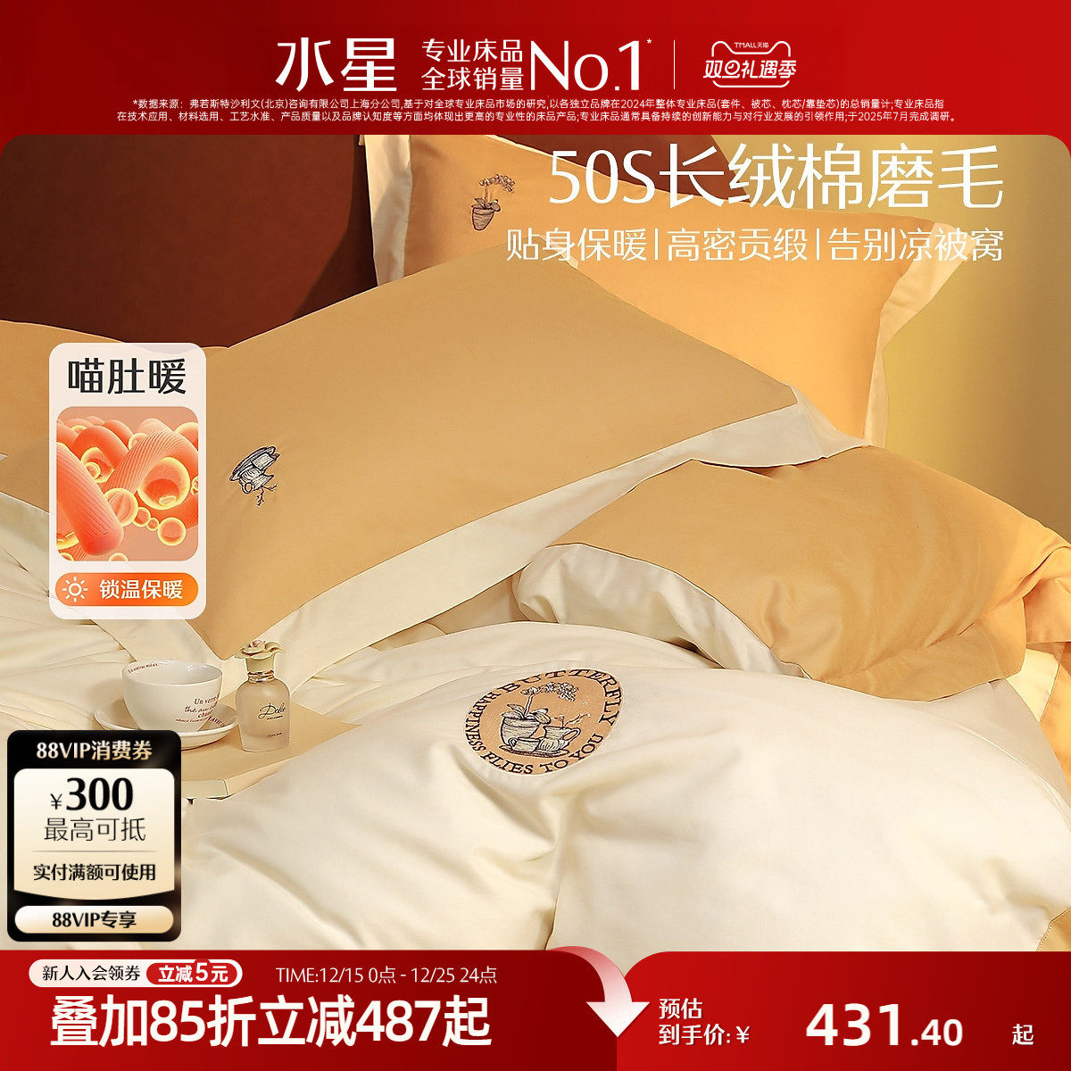 水星家纺全棉磨毛四件套纯棉抗菌加厚保暖床上用品秋冬天床单被套