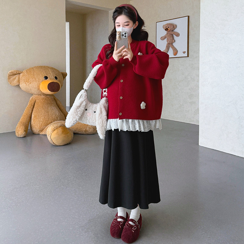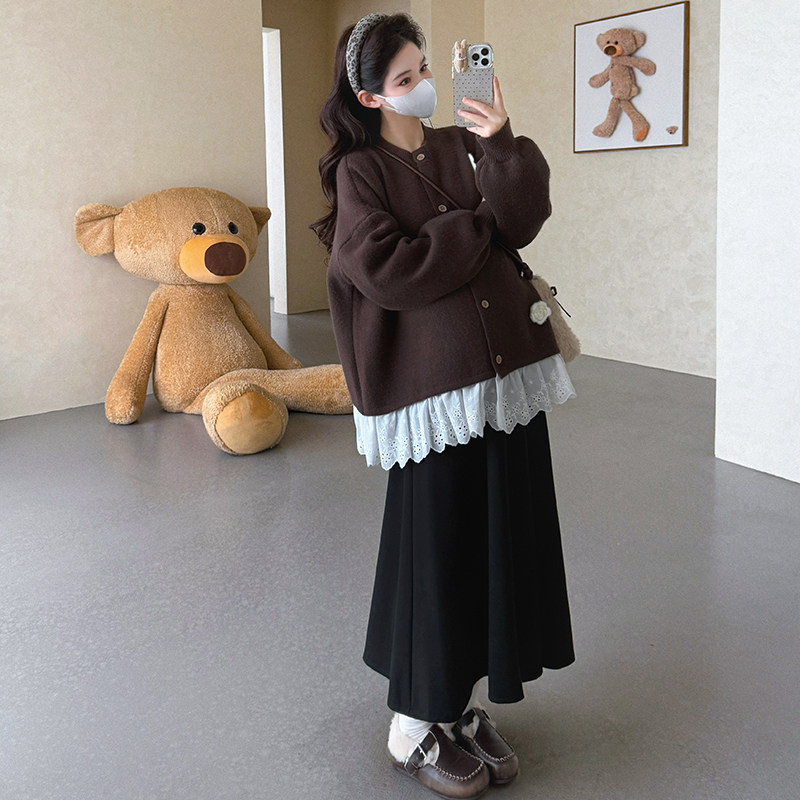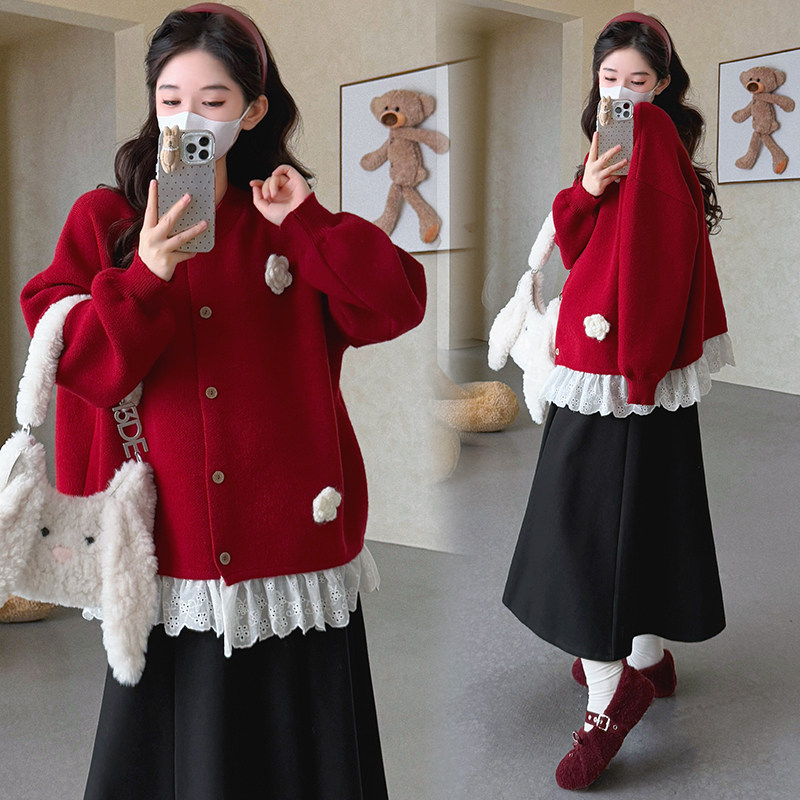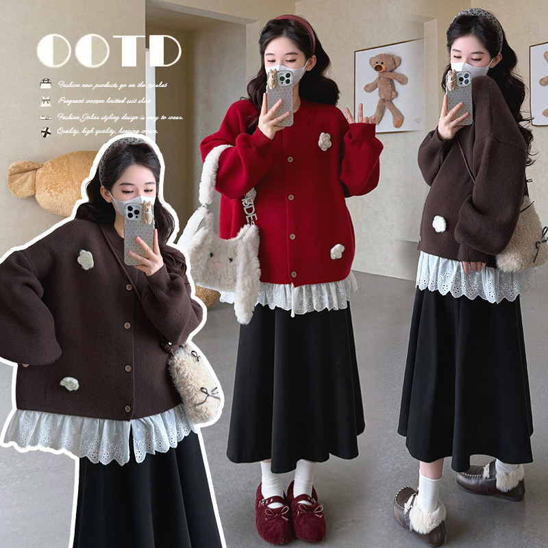 婧麒孕妇装冬装新款洋气蕾丝边毛衣外套孕期半身裙子高级孕妇套装