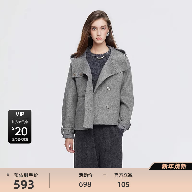 sdeer圣迪奥女装25年新品高领连帽双排扣双面呢短款大衣S254Z2608