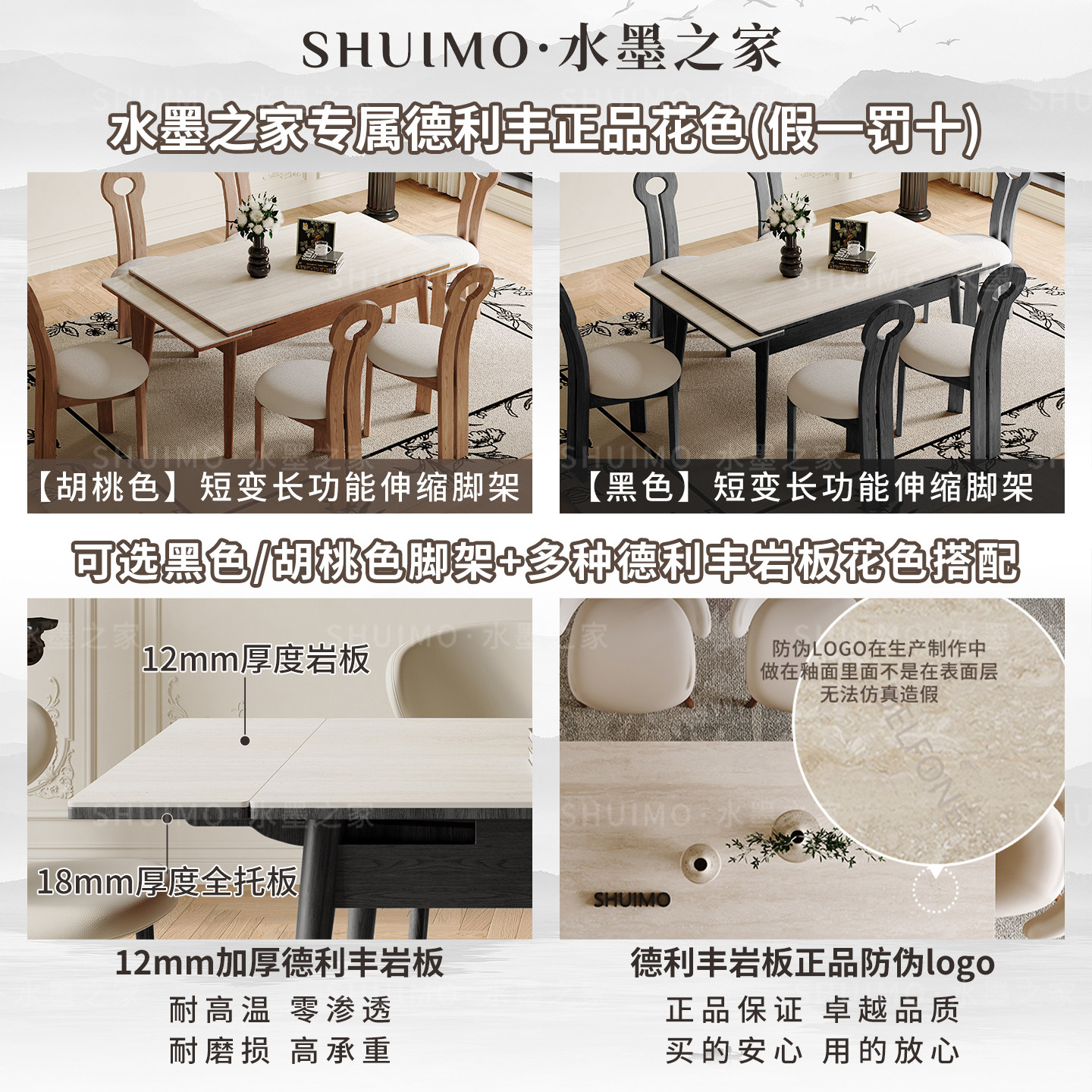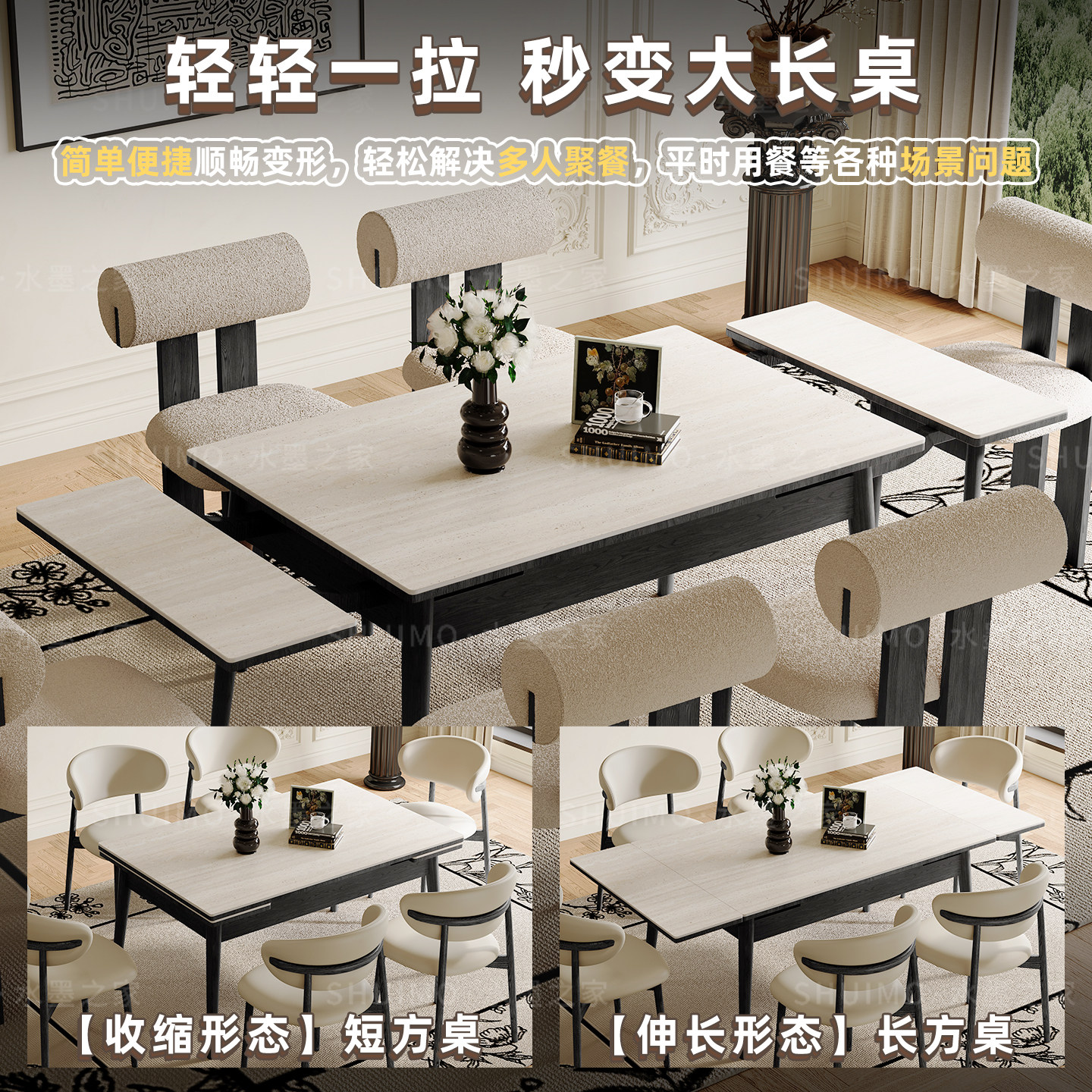 可伸缩德利丰岩板餐桌实木变长小户型长方形白蜡木中古风折叠桌子