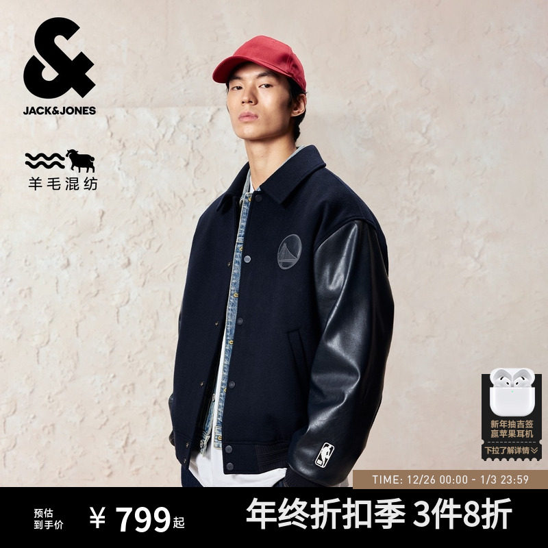 杰克琼斯男装秋冬毛呢大衣2025年新款NBA联名翻领按扣长袖外套
