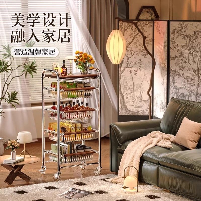北欧可移动推车不锈钢家用收纳小推车ins风原木色沙发边几置物架