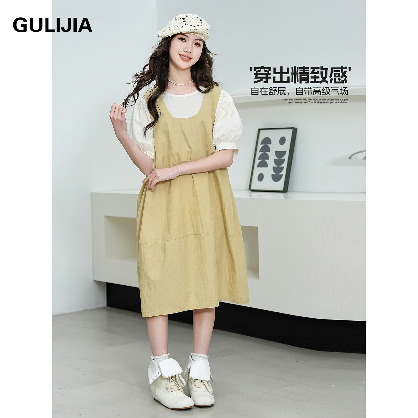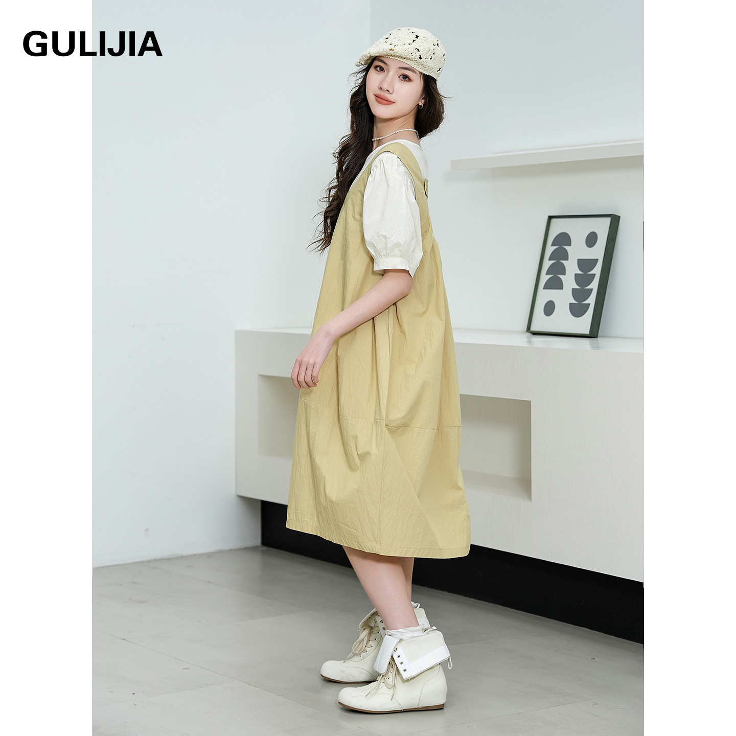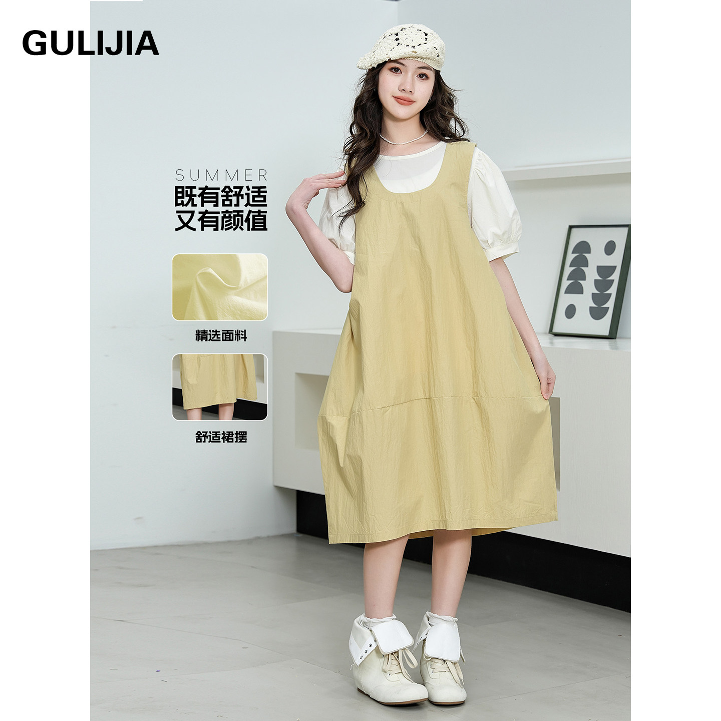 GULIJIA学院风背带连衣裙女大童夏季新款初中生宽松假两件文艺裙