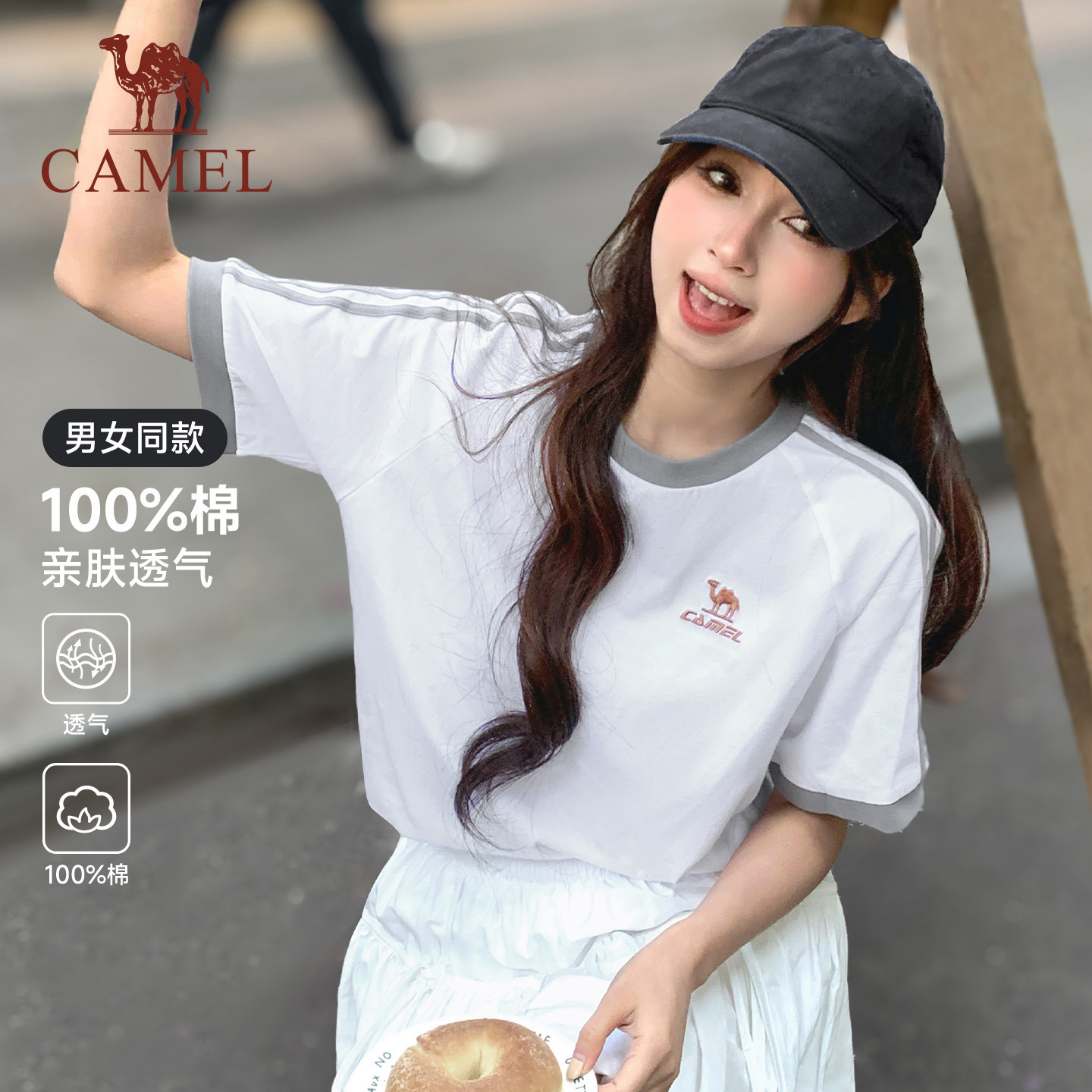 骆驼柔绵T神春夏季棉t恤女短袖圆领情侣复古宽松运动休闲上衣男
