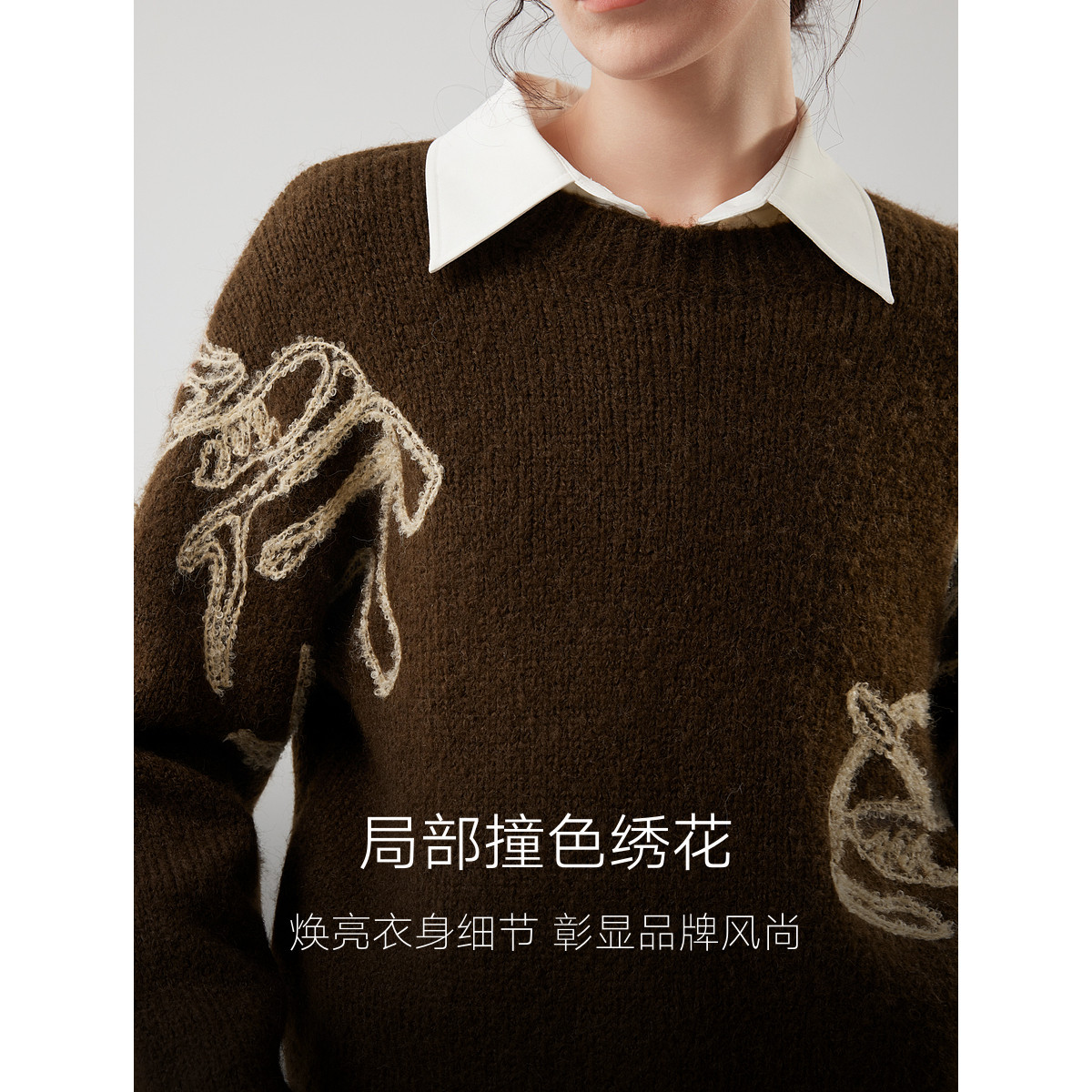 ELLE法式撞色绣花圆领针织衫女2025冬季新款设计感休闲软糯毛衣
