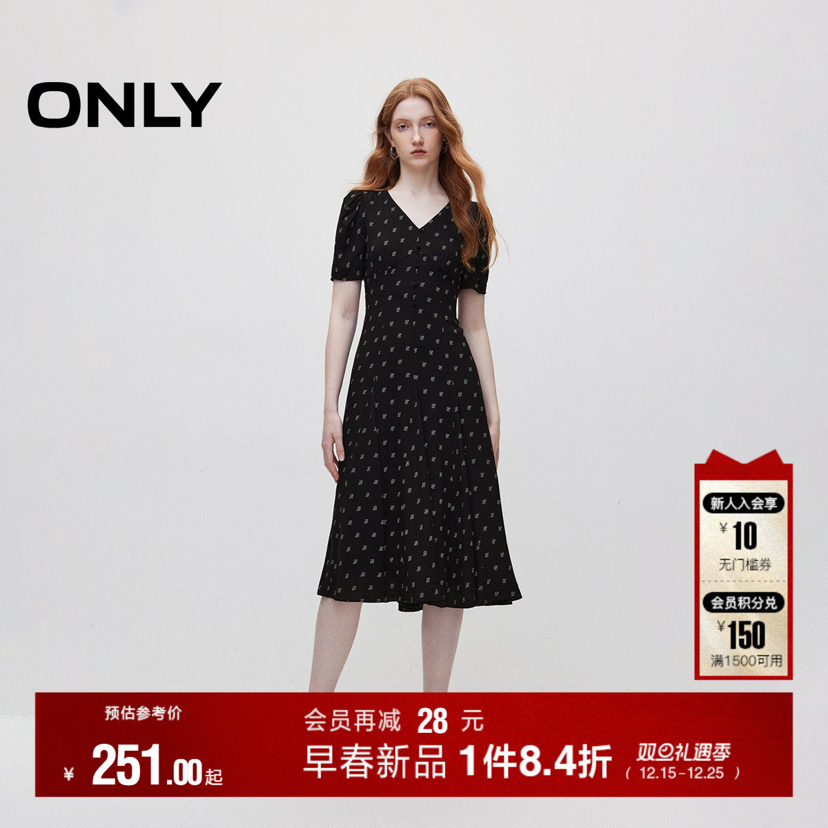 ONLY夏季复古显瘦V领泡泡袖中长裙连衣裙女|124307015