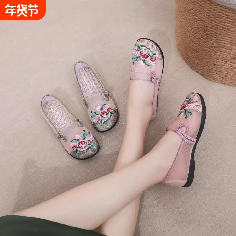 老北京布鞋女网纱透气鞋子中老年软底妈妈鞋夏季网面一脚蹬平底